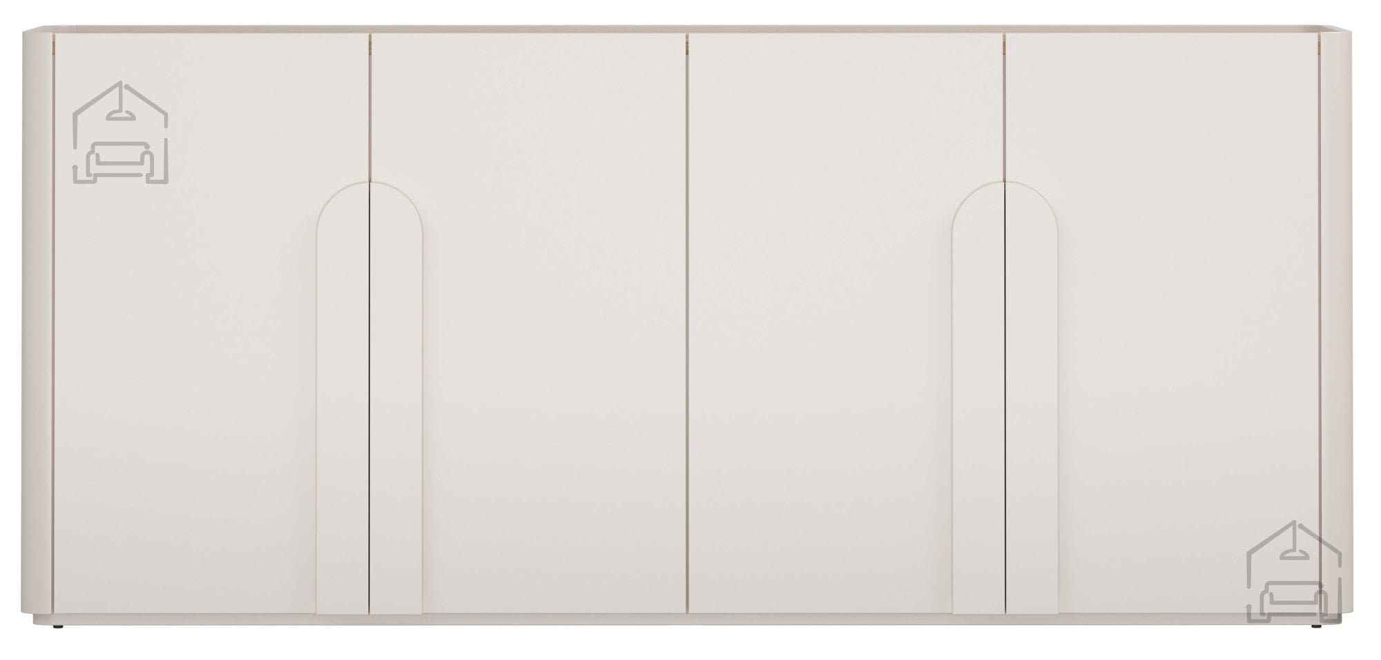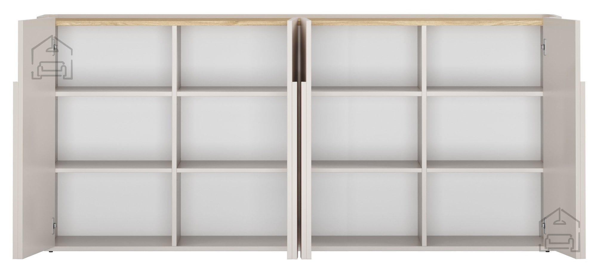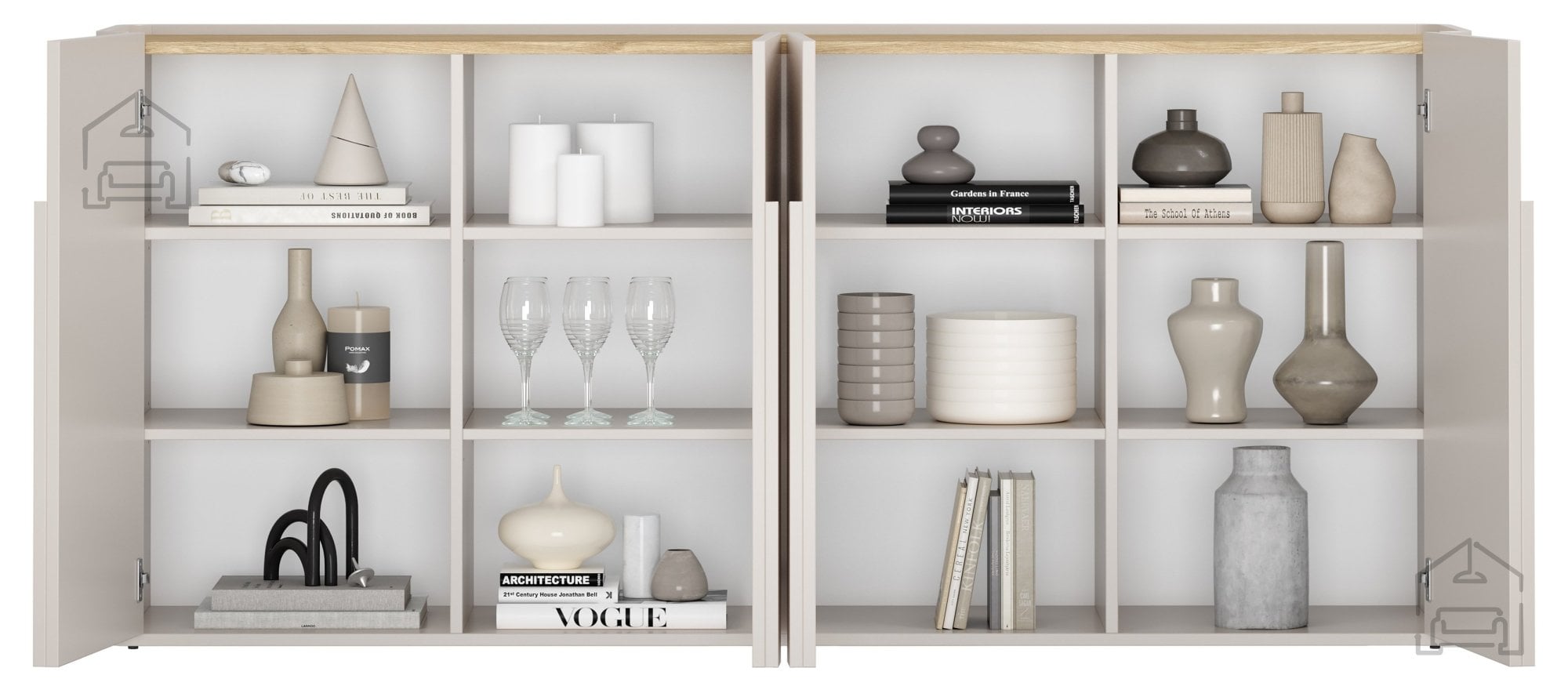Dimenzije 200 × 48 × 89 cm omogočajo, da komoda ponuja veliko prostora za shranjevanje, ne da bi preobremenila prostor. Štiri vratne omarice odpirajo pogled na prostorno notranjost z osmimi nastavljivimi policami, ki jih je mogoče prilagoditi v treh višinah. Ta prilagodljivost omogoča učinkovito shranjevanje dokumentov, oblačil, posode ali dekorativnih predmetov. Komoda se zato odlično znajde v dnevni sobi, jedilnici, spalnici ali celo domači pisarni.