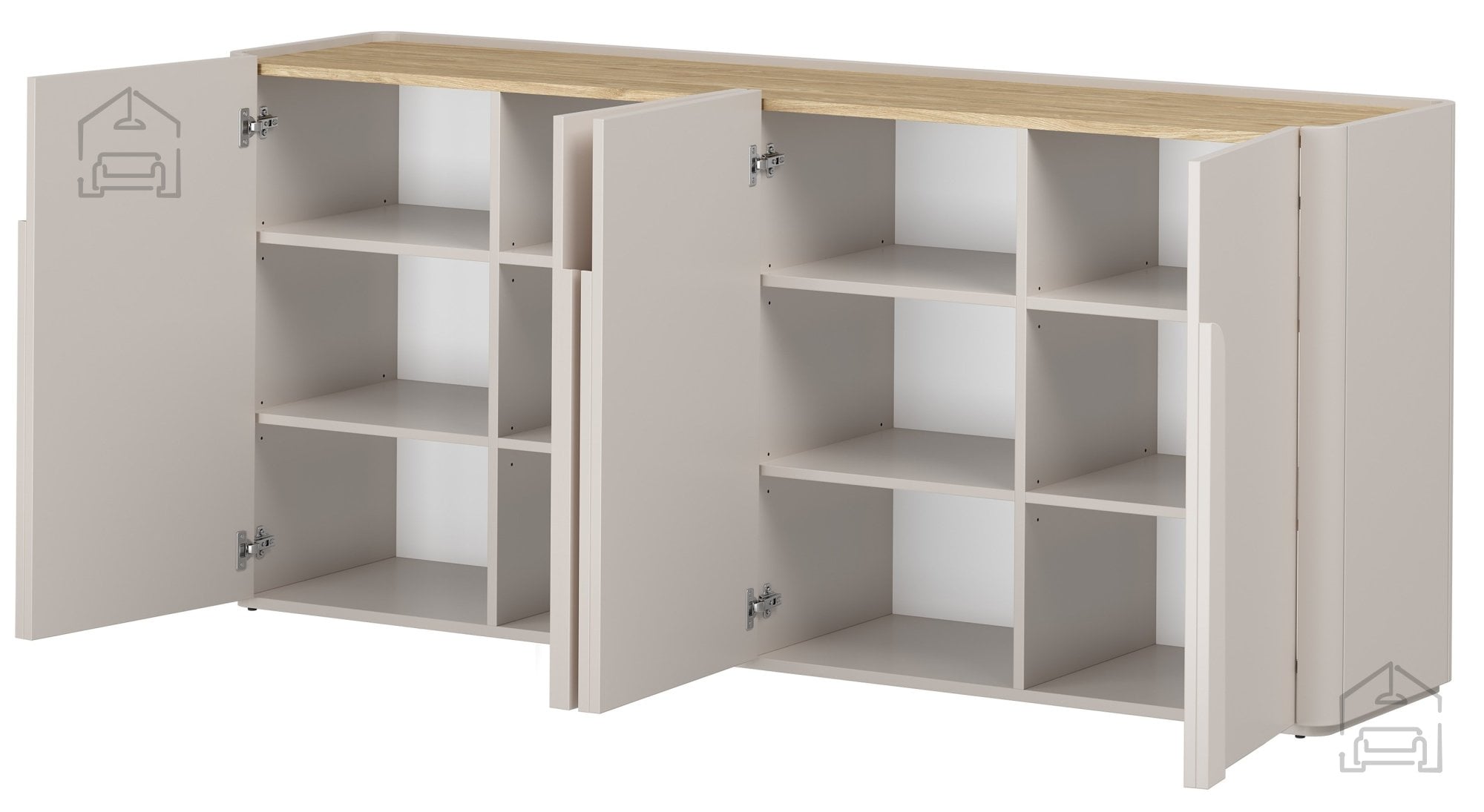Komoda Amilio 200 4D znamke Bogart združuje estetiko, funkcionalnost in kakovostno izdelavo v elegantnem kosu pohištva, ki se popolnoma ujema z različnimi bivalnimi prostori. Izdelana je iz melaminskih plošč debeline 18 mm, sprednje stranice so iz MDF plošč 18 mm, zadnja stran pa iz HDF plošče 3 mm. Kombinacija barv kašmir in naoljeni hrast skupaj z ročaji v barvi kašmirja ustvarja sodoben, mehko kontrasten videz, ki v prostor vnese toplino in umirjenost. Površine so gladke in enostavne za čiščenje, zaobljeni robovi pa dodajo občutek varnosti ter prefinjenosti.