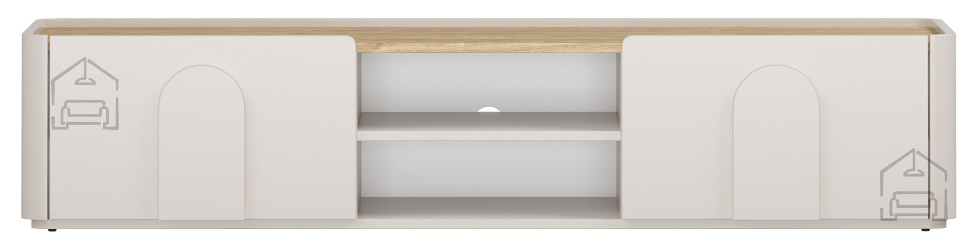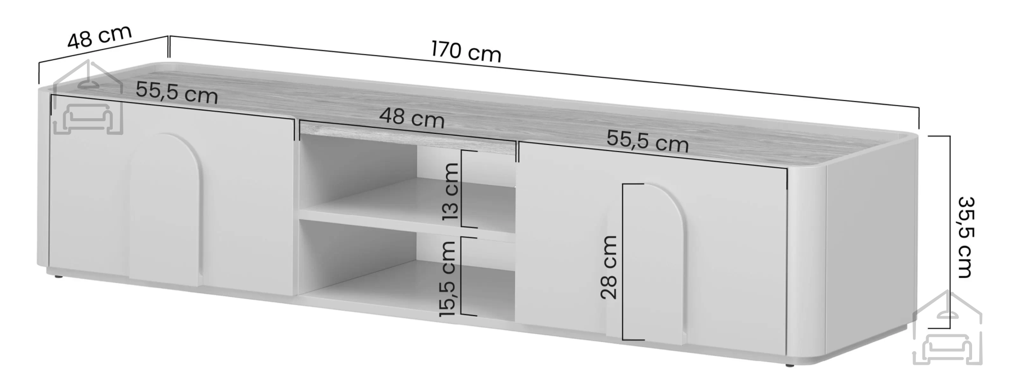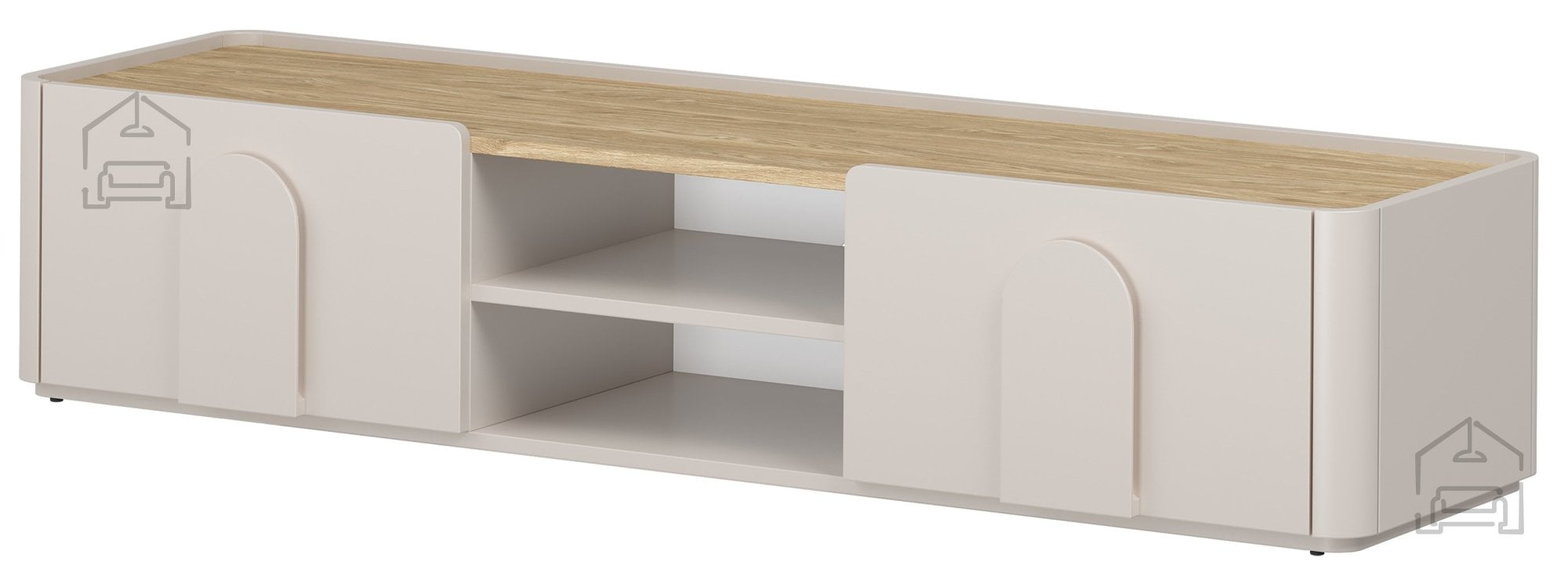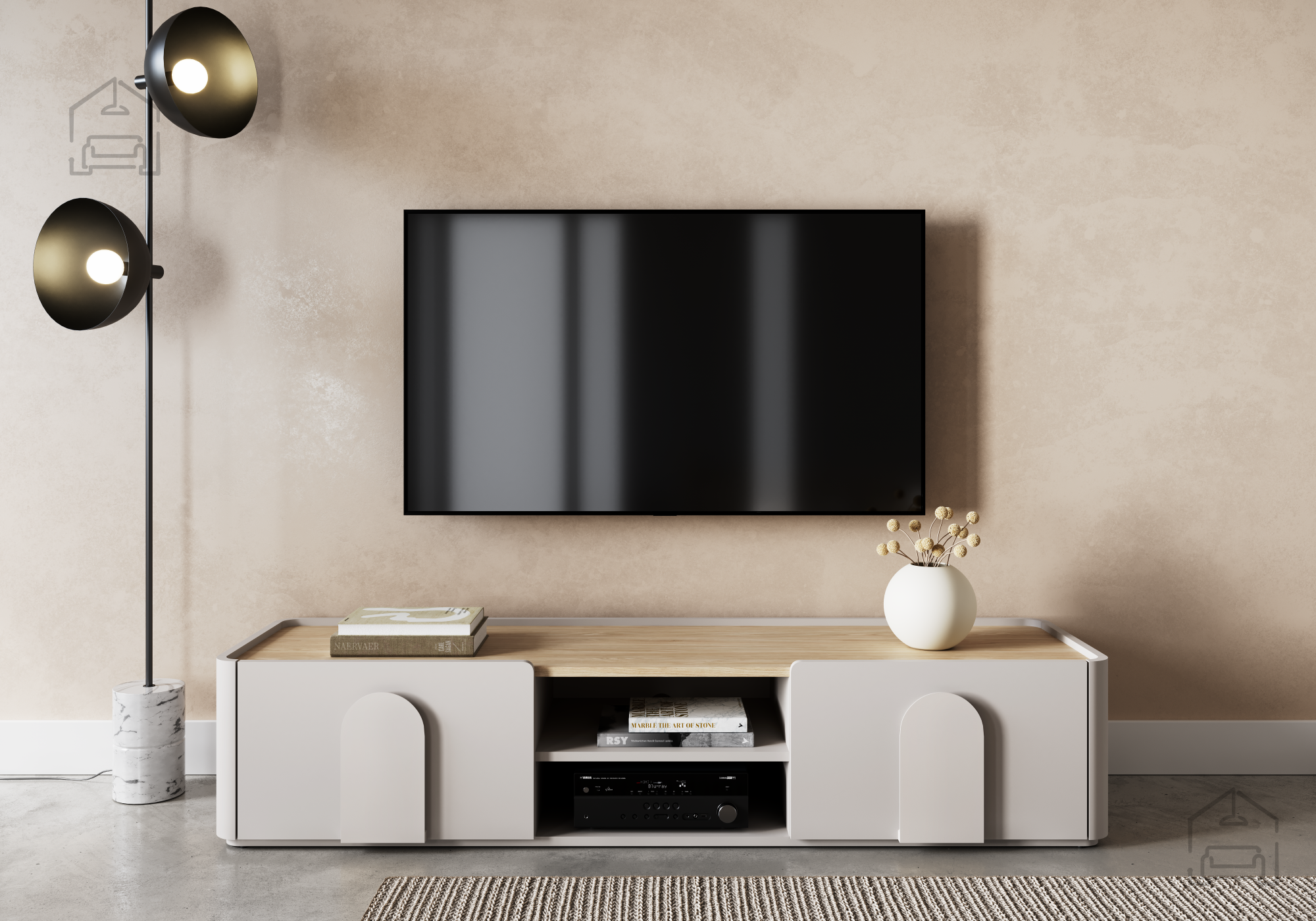 Na vrhnjo ploščo lahko postavite televizor, zvočnike ali osebne dekoracije, kot so rastline, sveče ali fotografije. Zaradi uravnoteženih proporcev in umirjene barvne palete komoda ne prevlada prostora, temveč ga dopolni. Mehke linije in zaobljeni robovi prispevajo k občutku varnosti in vizualne mehkobe.