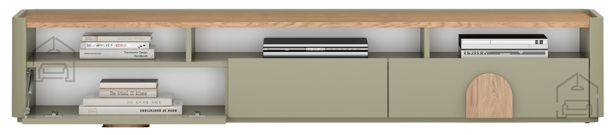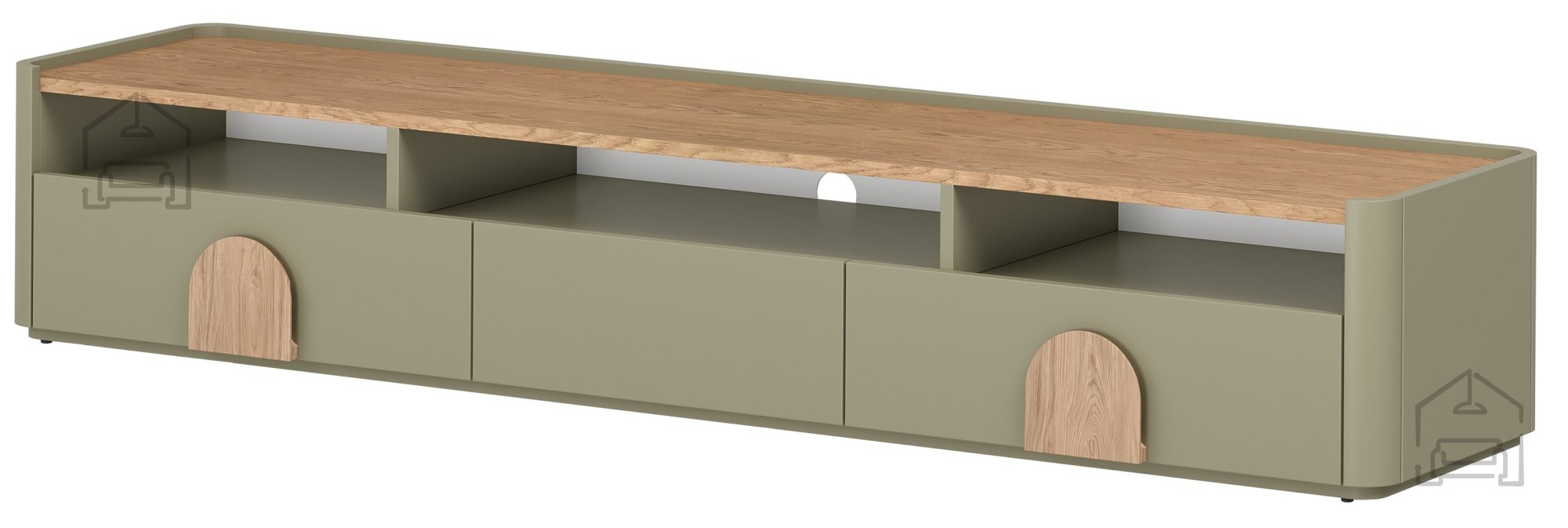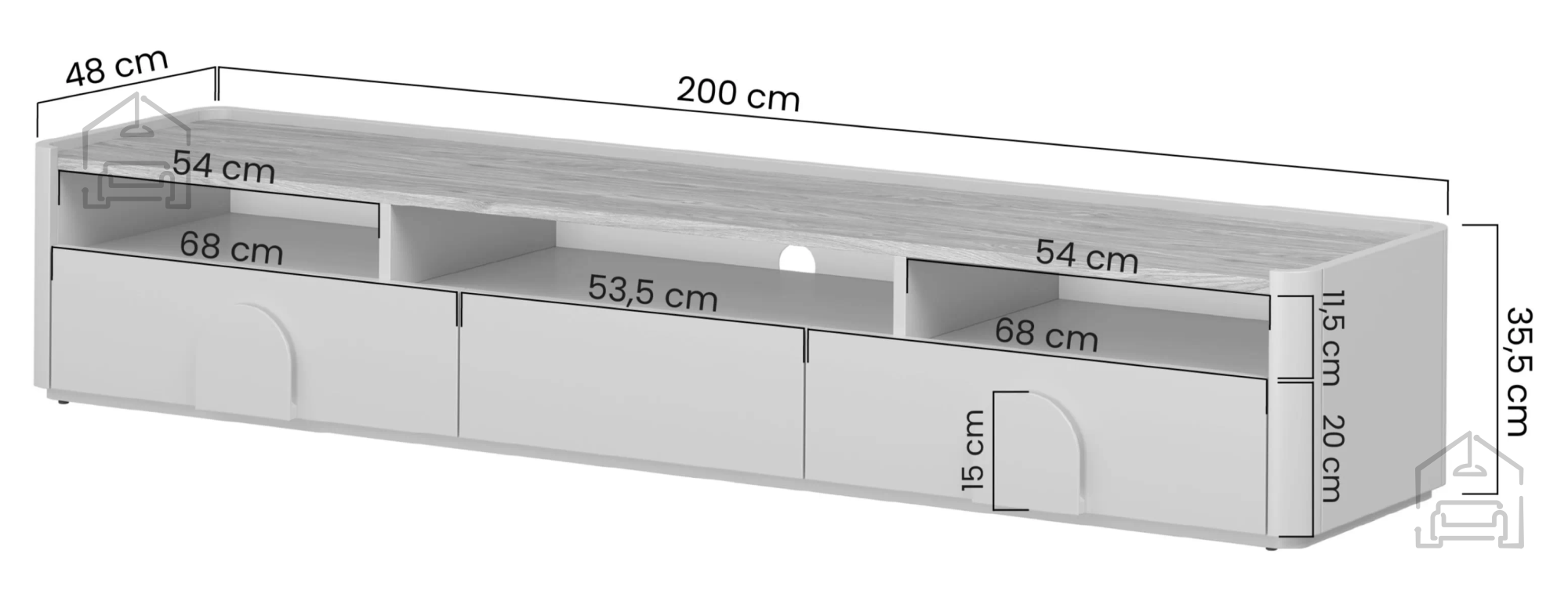 Skupna dolžina 200 cm nudi dovolj površine za postavitev televizorjev različnih diagonal, dodatne dekoracije ali zvočnikov. Globina 48 cm omogoča stabilno postavitev, višina 35,5 cm pa zagotavlja nizko in elegantno silhueto, ki ne preobremeni prostora. Komoda se zato odlično poda tako v manjše dnevne sobe kot v večje odprte prostore, kjer deluje kot osrednji estetski element.