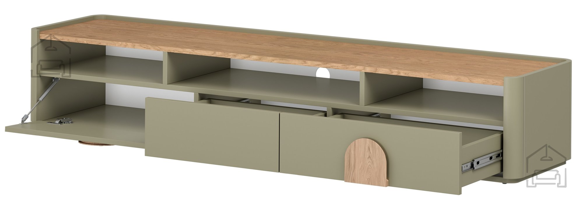 Model Amilio 200 1K2SZ je zasnovan z mislijo na praktičnost. Opremljen je s soft‑close sistemom zapiranja, ki omogoča tiho in nežno zapiranje vrat ter predalov. Ta mehanizem ne le povečuje udobje uporabe, temveč tudi zmanjšuje obrabo tečajev in vodil. V notranjosti se skriva premišljena razporeditev prostora – kombinacija zaprtega predela in dveh predalov omogoča shranjevanje večjih predmetov, kablov, daljinskih upravljalnikov ali dokumentov. Komoda ima tudi odprtino za kable, kar omogoča urejeno povezavo elektronskih naprav brez vidnih žic.