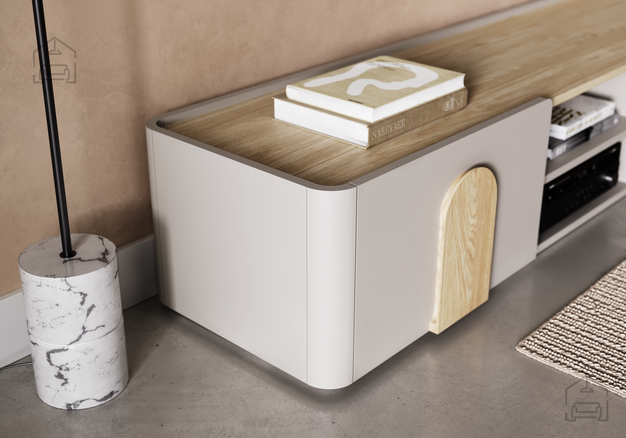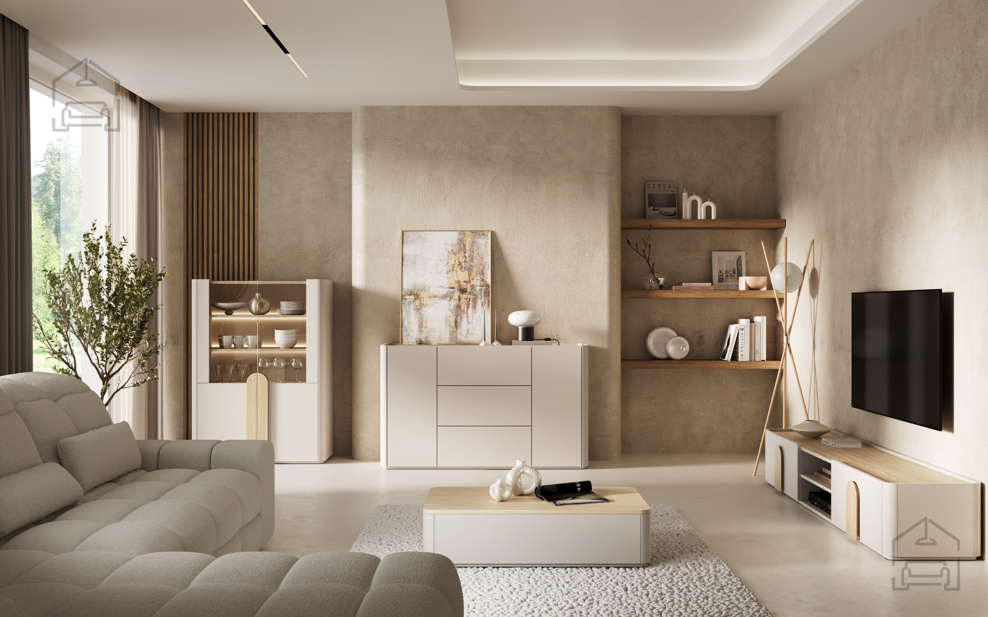 Enotna linija oblikovanja omogoča kombiniranje različnih elementov – od nizkih komod in vitrin v dnevnem prostoru do garderobnih omar in nočnih omaric v spalnici. Tako lahko ustvarite celovit, estetsko dovršen in funkcionalen interier.