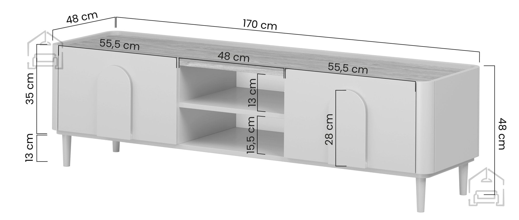 Njene kompaktne mere omogočajo umestitev v različne tipe prostorov – od manjših dnevnih sob do večjih odprtih dnevno-kuhinjskih povezav. Višina 48 cm je idealna za udobno gledanje televizije s sedežne garniture, hkrati pa ponuja dovolj prostora za dekorativne dodatke ali zvočni sistem.