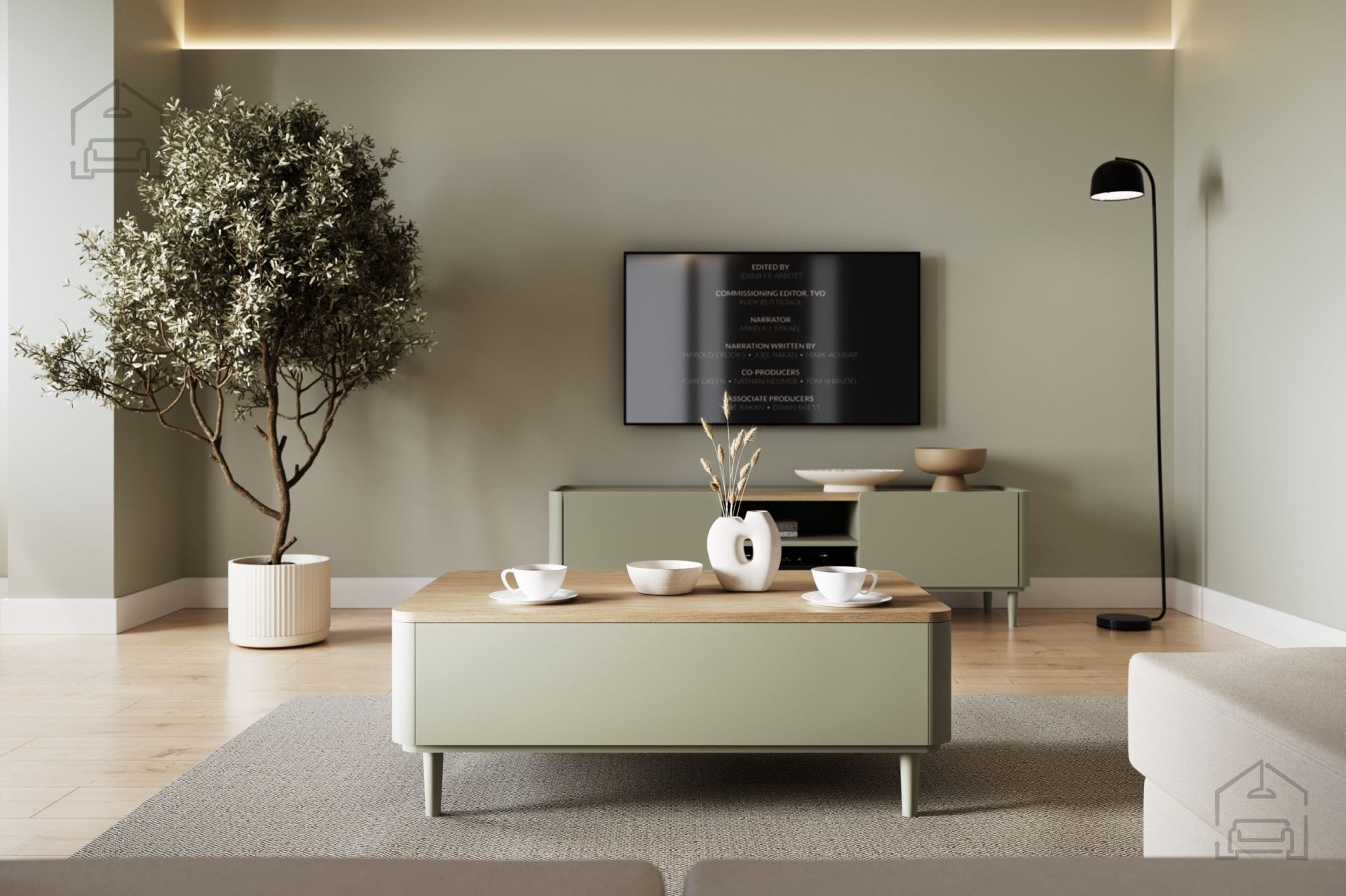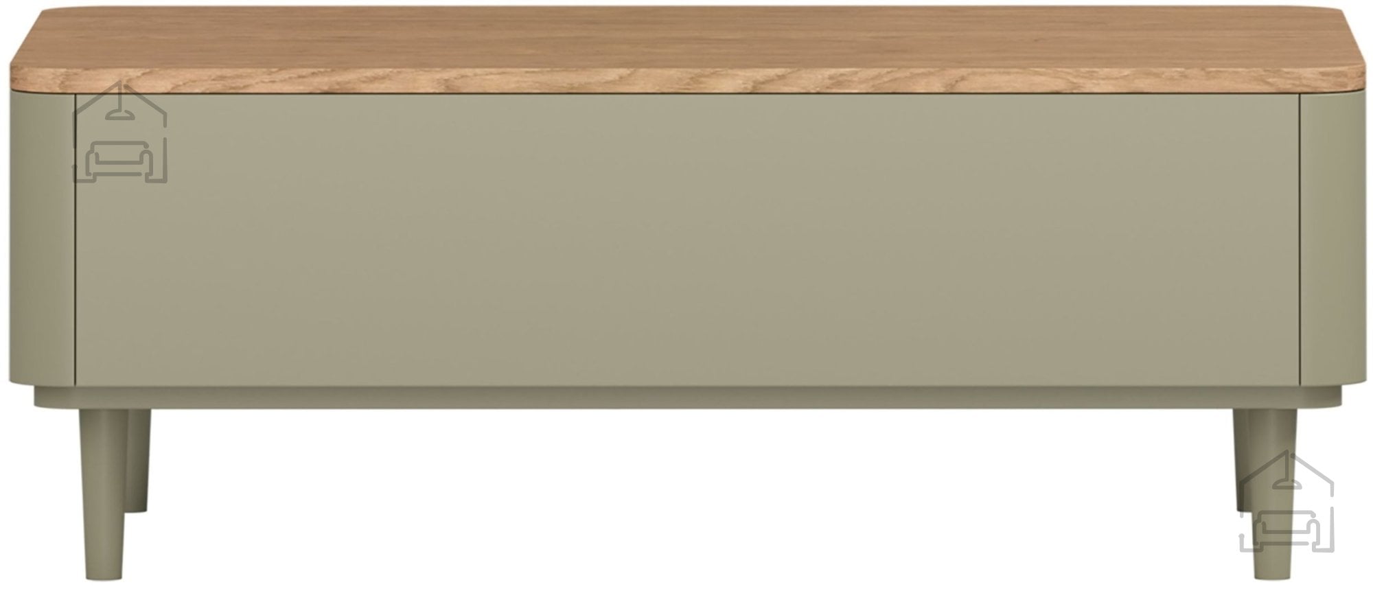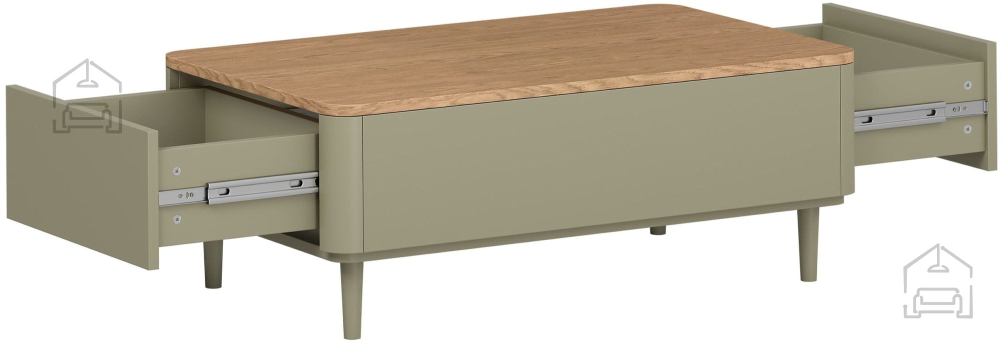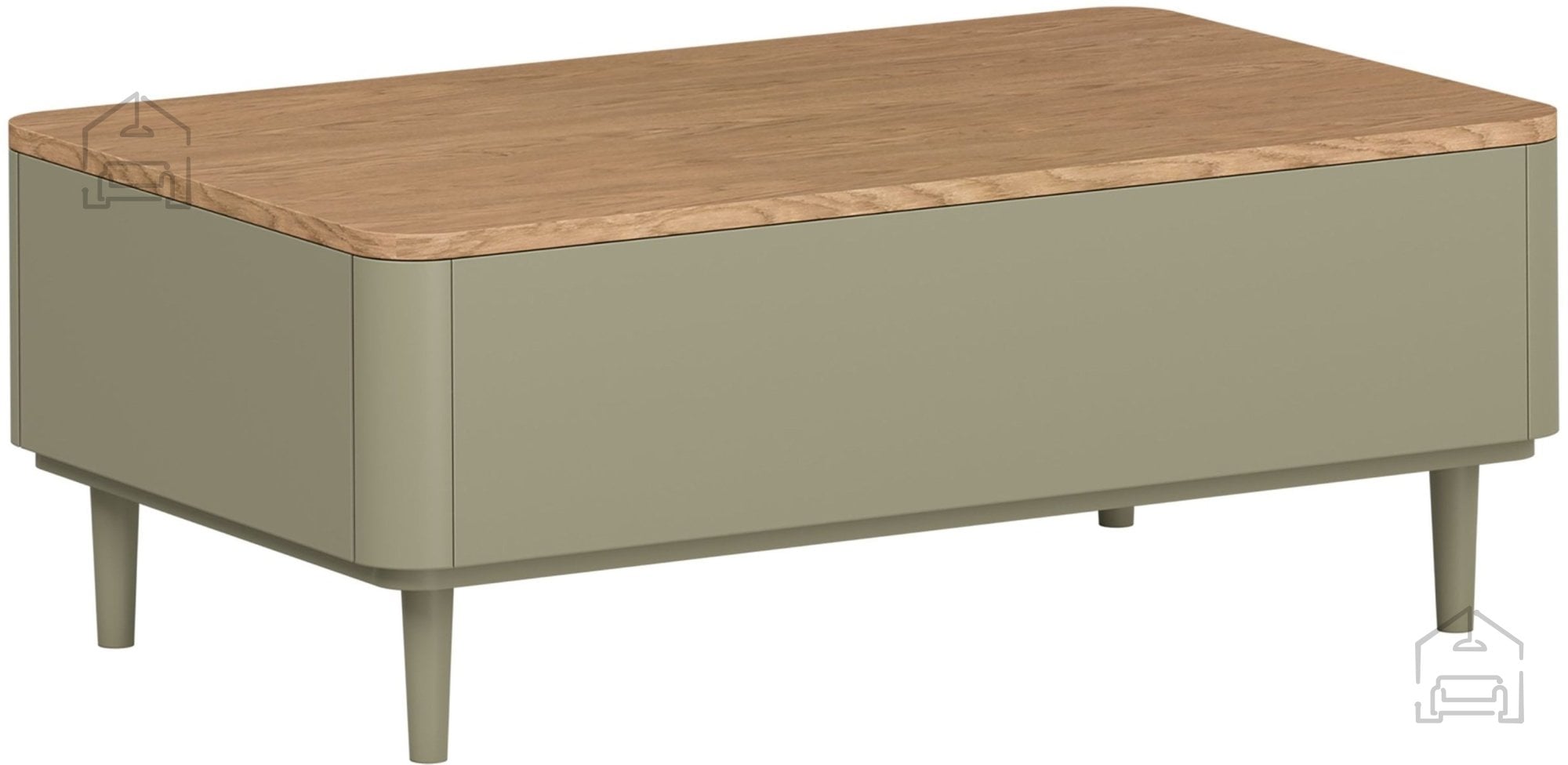 Miza sledi trendom naravnih barvnih kontrastov. Korpus in fronte so v toplem tonu evkaliptusa, medtem ko zgornja plošča v barvi hrast Baltic Dune prinaša subtilno razgibanost in občutek naravnega lesa. Nogice iz bukovega lesa v višini 13 cm so prav tako obdelane v odtenku evkaliptusa, kar ustvarja harmonično celoto. Takšna kombinacija barv se lepo ujema z različnimi slogi notranje opreme – od skandinavskega in minimalističnega do sodobno rustikalnega.