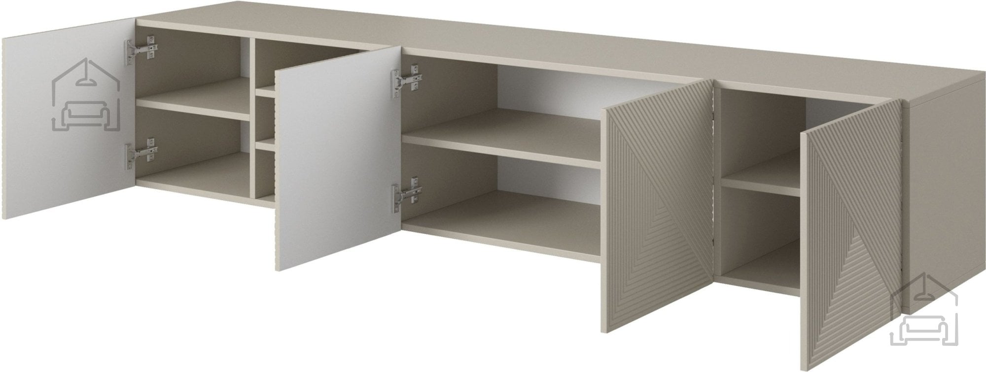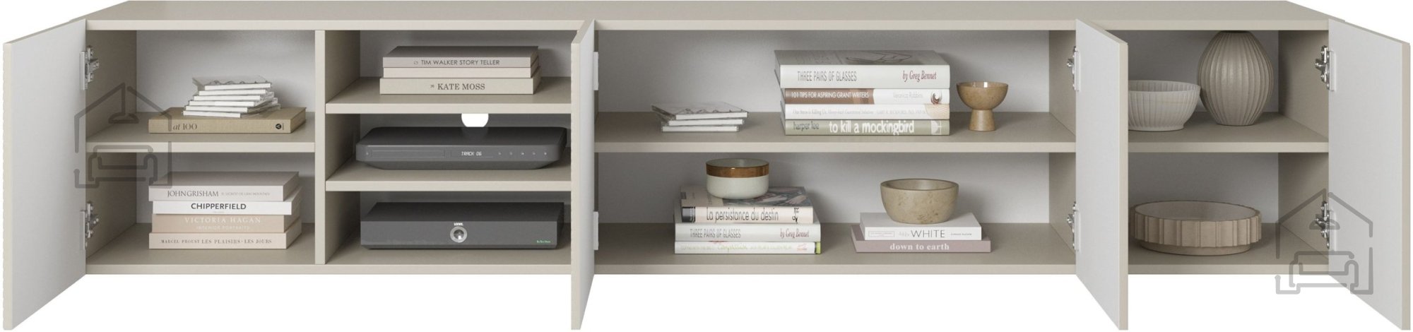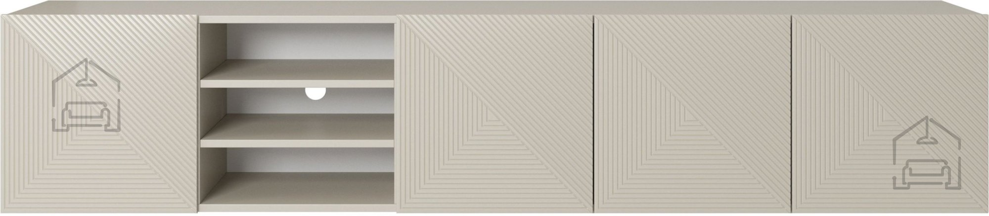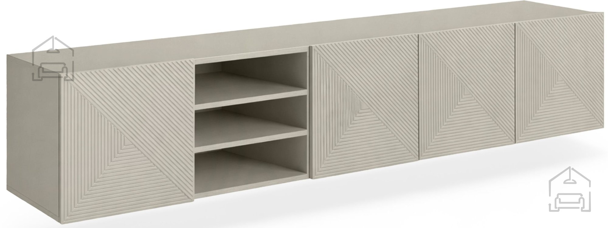 Stenska TV komoda Asha 200 5D blagovne znamke Bogart je zasnovana za tiste, ki cenijo minimalističen videz, kakovostne materiale in premišljeno funkcionalnost. Z dimenzijami 200x40x40 cm nudi dovolj prostora za shranjevanje multimedijskih naprav, dodatkov in osebnih predmetov, hkrati pa s svojo izčiščeno obliko v prostoru deluje lahkotno in prefinjeno. Komoda v barvi kašmir doda interierju toplino in subtilno eleganco, ki se harmonično ujema z različnimi barvnimi shemami sodobnih domov.