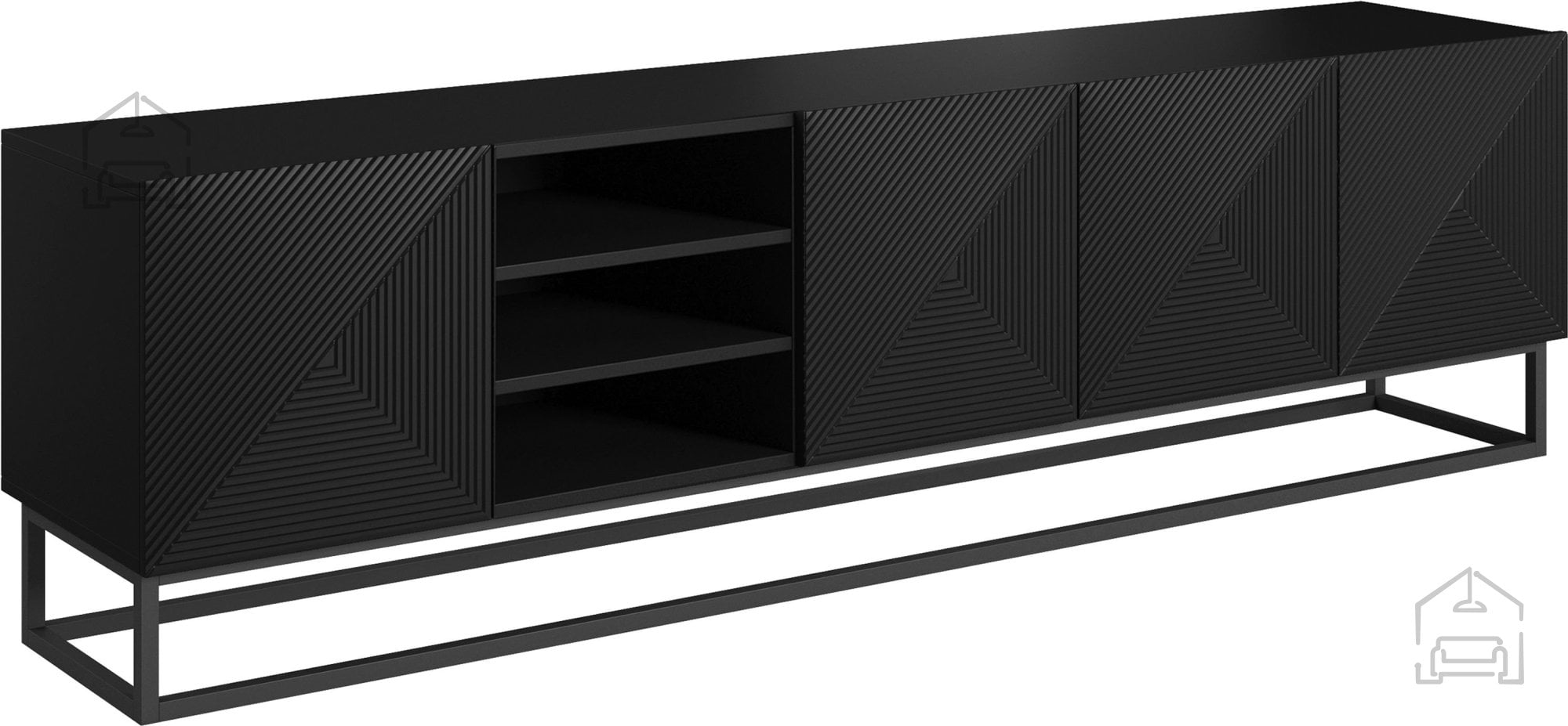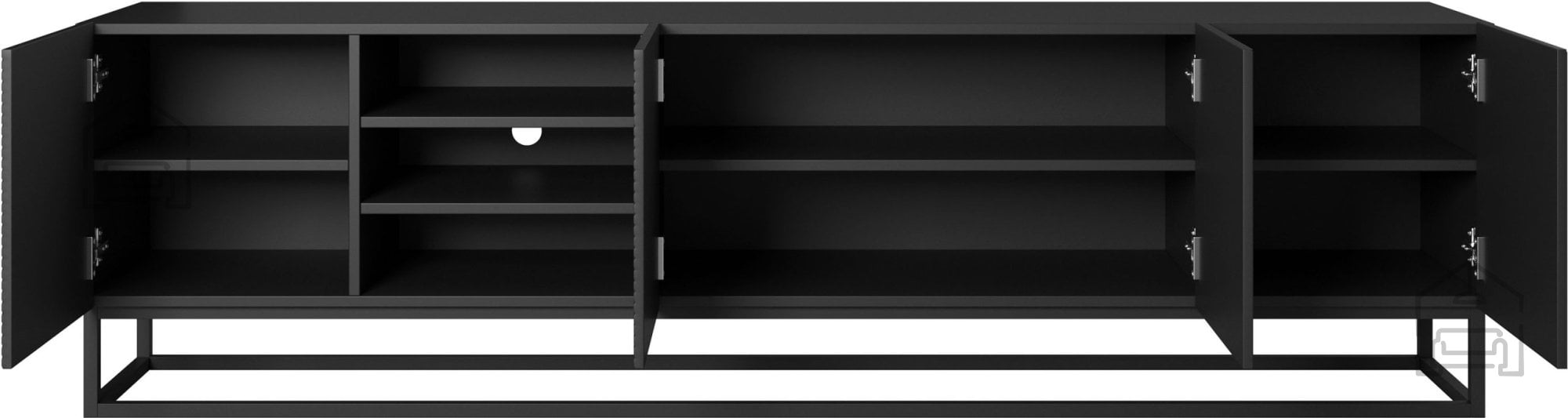 Noge so oblikovane kot kovinski okvir, prašno barvan v črni barvi. Takšna izvedba nudi trdnost in sodoben videz, hkrati pa omogoča enostavno čiščenje prostora pod komodo. Zaradi kovinske baze je komoda stabilna tudi pri večjih obremenitvah, kar je idealno za televizorje večjih dimenzij.