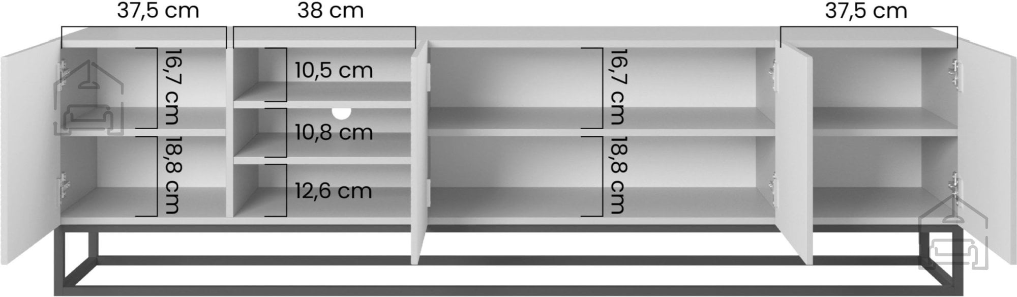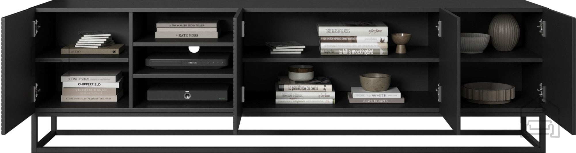 Komoda vključuje več zaprtih predelov in odprte police, kar omogoča priročno organizacijo. Odprte police so primerne za multimedijske naprave, kot so igralne konzole, sprejemniki ali predvajalniki, medtem ko zaprti deli nudijo prostor za shranjevanje kablov, dokumentov ali drugih predmetov. Zaradi preproste zasnove se komoda odlično prilega sodobnim dnevnim sobam, lahko pa jo kombinirate tudi z drugimi elementi iz kolekcije.