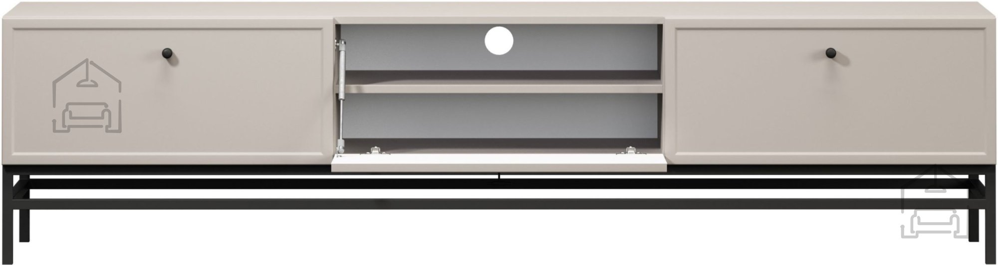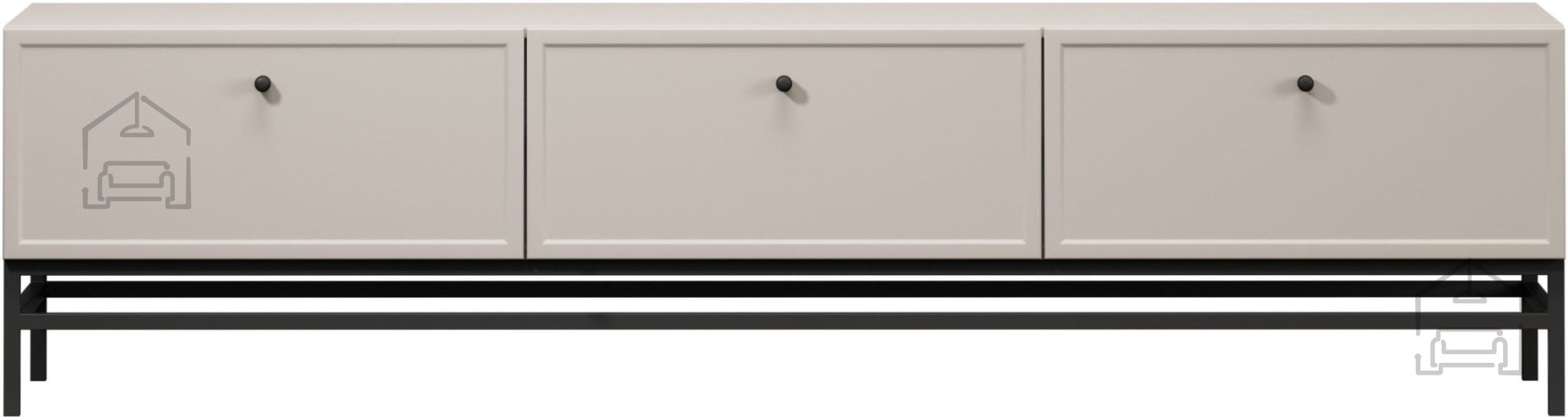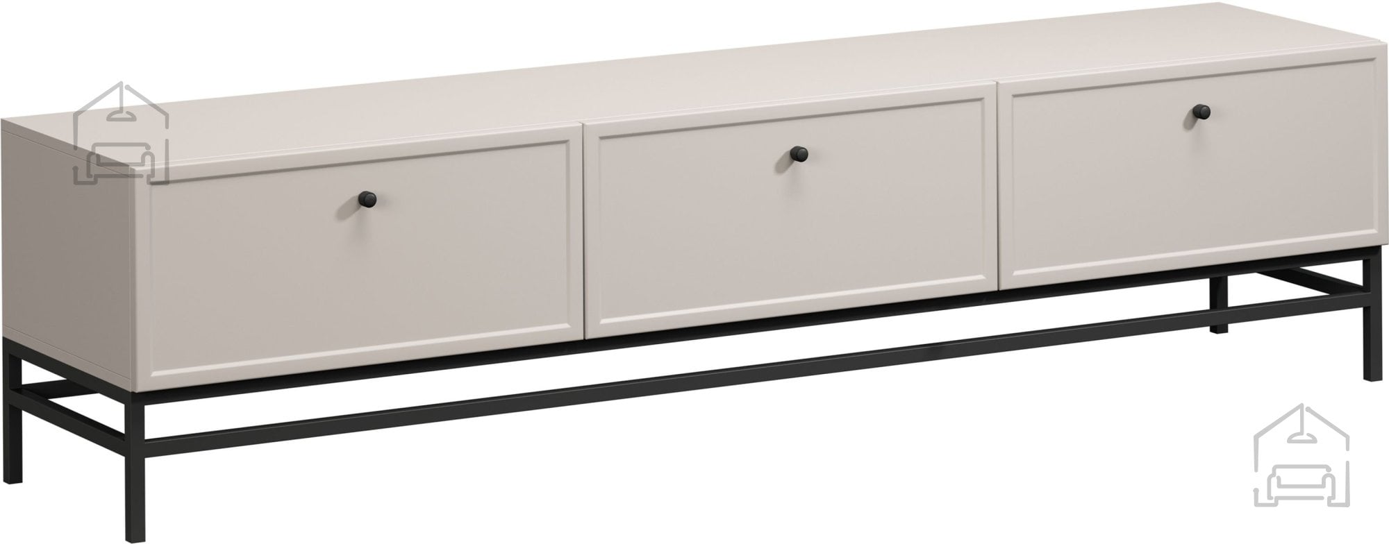 Celotna komoda je v nežnem odtenku kašmir, ki deluje toplo in prijetno, hkrati pa se brez težav ujema s številnimi barvnimi kombinacijami sodobnih interierjev. Kovinski ročaji so na voljo v črni izvedbi, kar omogoča subtilno prilagoditev osebnemu okusu. Kovinske noge v obliki okvirja so v črni barvi in dvignejo komodo 20 cm od tal, kar olajša čiščenje pod njo ter daje kosu vizualno lahkotnost.
