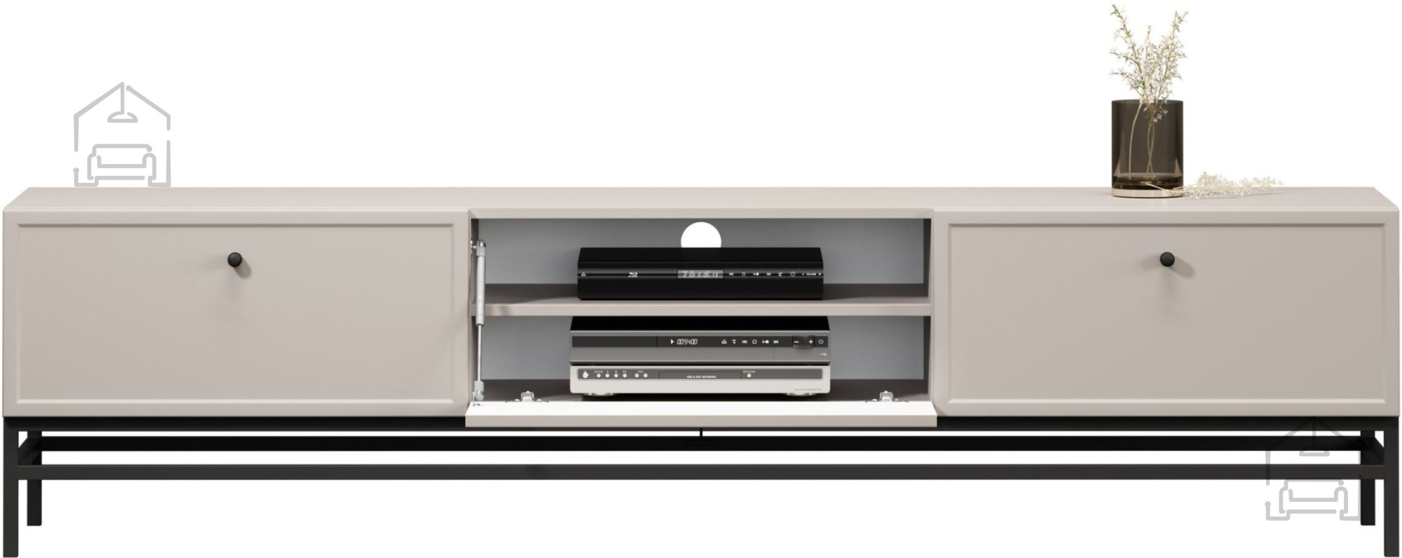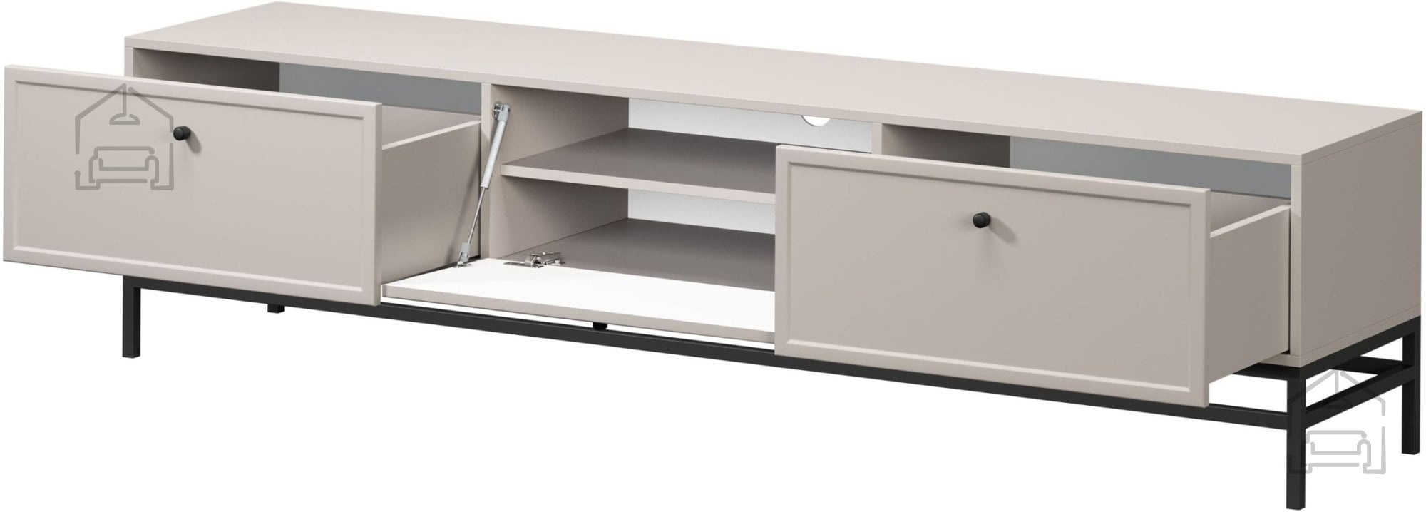 TV komoda Lorini vključuje dve prostorni predali, eno omarico z vratci ter eno polico. Takšna razporeditev omogoča pregledno shranjevanje vseh komponent domačega kina, kablov, daljincev ali dekorativnih predmetov. Predali se odpirajo klasično z ročaji, njihovo gibanje pa poteka po vodilih z mehkim zapiranjem (soft‑close), ki zagotavljajo tiho in udobno uporabo.