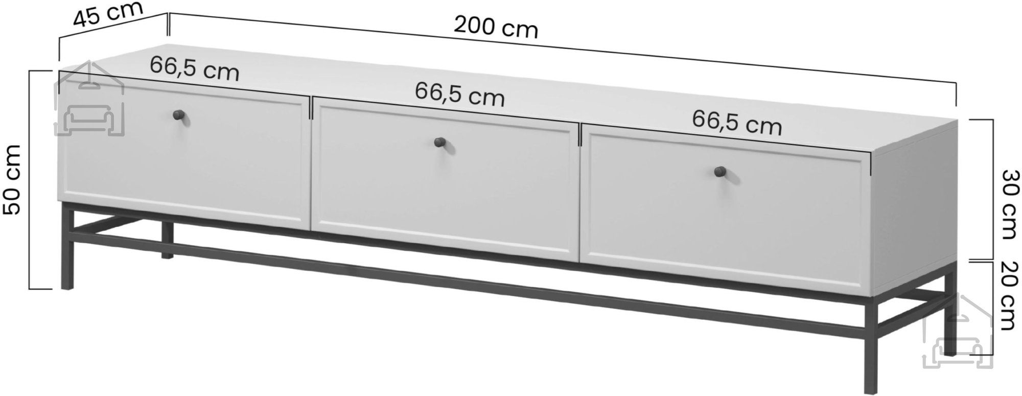 Komoda z dolžino 200 cm omogoča postavitev večjega televizorja in hkrati nudi dovolj prostora za druge predmete, kot so knjige, okrasni dodatki ali hišni sistemi za zvok. Višina 50 cm zagotavlja optimalno višino gledanja televizije z običajnega kavča, kar povečuje udobje uporabe.