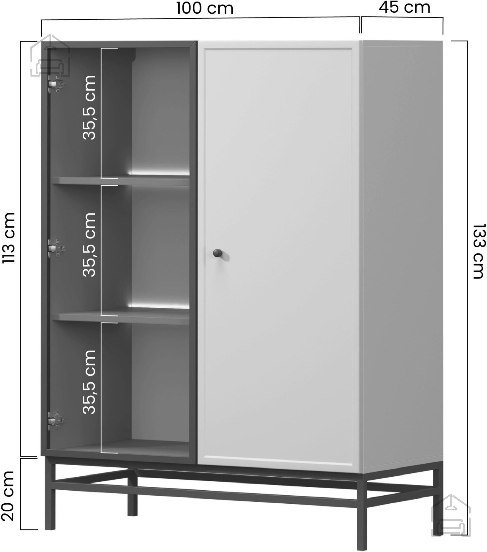 Osnova vitrine je izdelana iz melaminskih plošč, odpornih proti mehanskim poškodbam in praskam, kar olajša vzdrževanje. Frontni deli iz MDF plošč debeline 18 mm so znani po stabilnosti in gladki površini, ki omogoča precizno obdelavo robov. Hrbtna stran iz HDF plošče debeline 3 mm dodatno utrjuje konstrukcijo. Kovinski ročaji v črni barvi in okvirne noge višine 20 cm dajejo celoti industrijski pridih, hkrati pa omogočajo enostavno čiščenje tal pod omaro.
