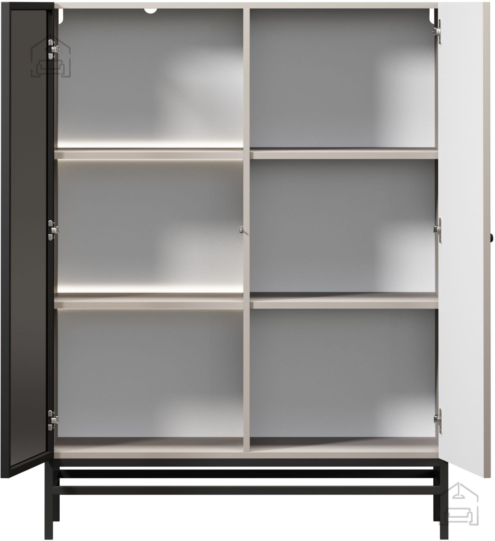 Notranjost vitrine je premišljeno razdeljena na dva dela z dvema vratoma in štirimi policami, izdelanimi iz pohištvene plošče. Takšna razporeditev omogoča optimalen izkoristek prostora za shranjevanje in razstavljanje. Police so dovolj trdne za različne vrste predmetov – od porcelana do knjig ali dekorativnih elementov. Celotno notranjost dopolnjuje LED osvetlitev, vključena v opremo, ki poudari vsebino in doda prijetno ambientalno svetlobo prostoru.