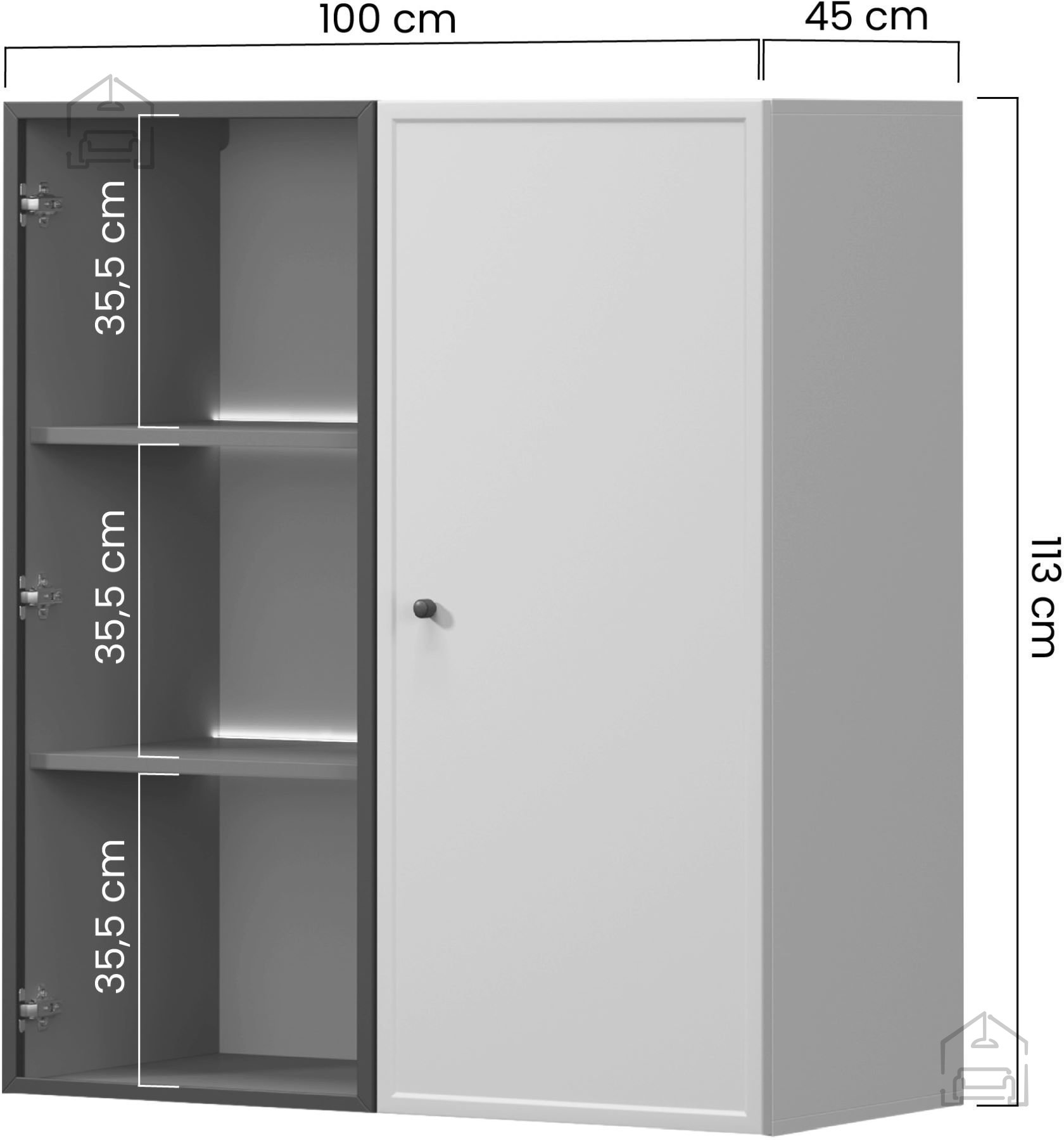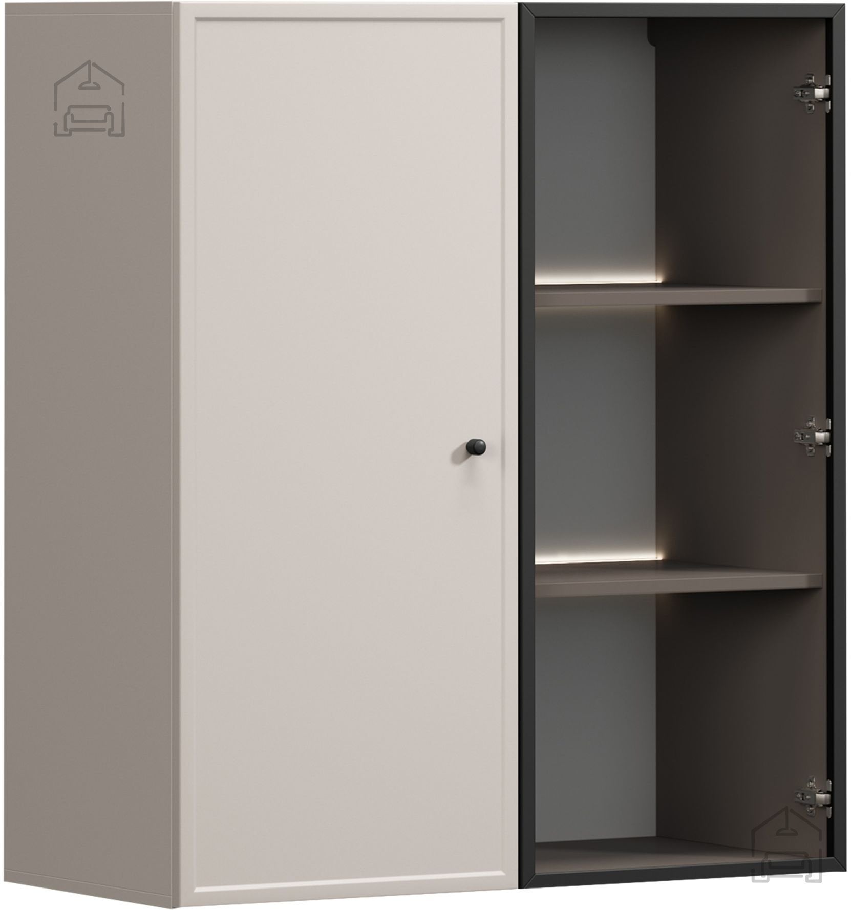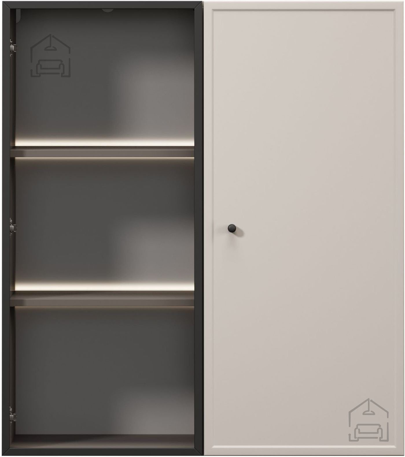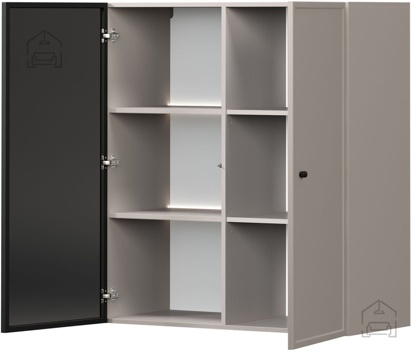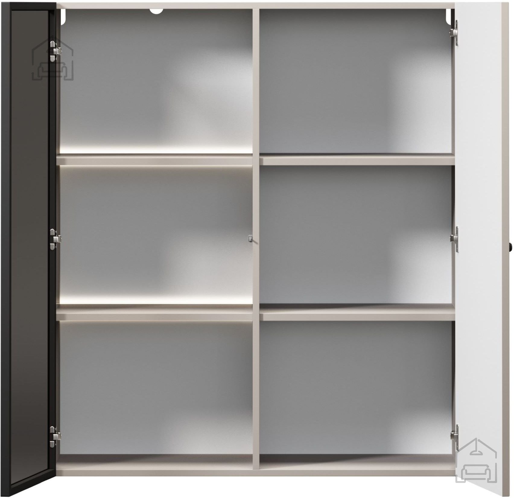 Vrata se odpirajo s tradicionalnim mehanizmom, ki je dopolnjen s tečaji iz jekla z mehkim zapiranjem (soft-close). Ta sistem preprečuje treskanje vrat, povečuje udobje pri uporabi in podaljšuje življenjsko dobo pohištva. Črni jekleni ročaji ustvarjajo kontrast z barvo korpusa in poudarijo sodobno estetiko vitrine.