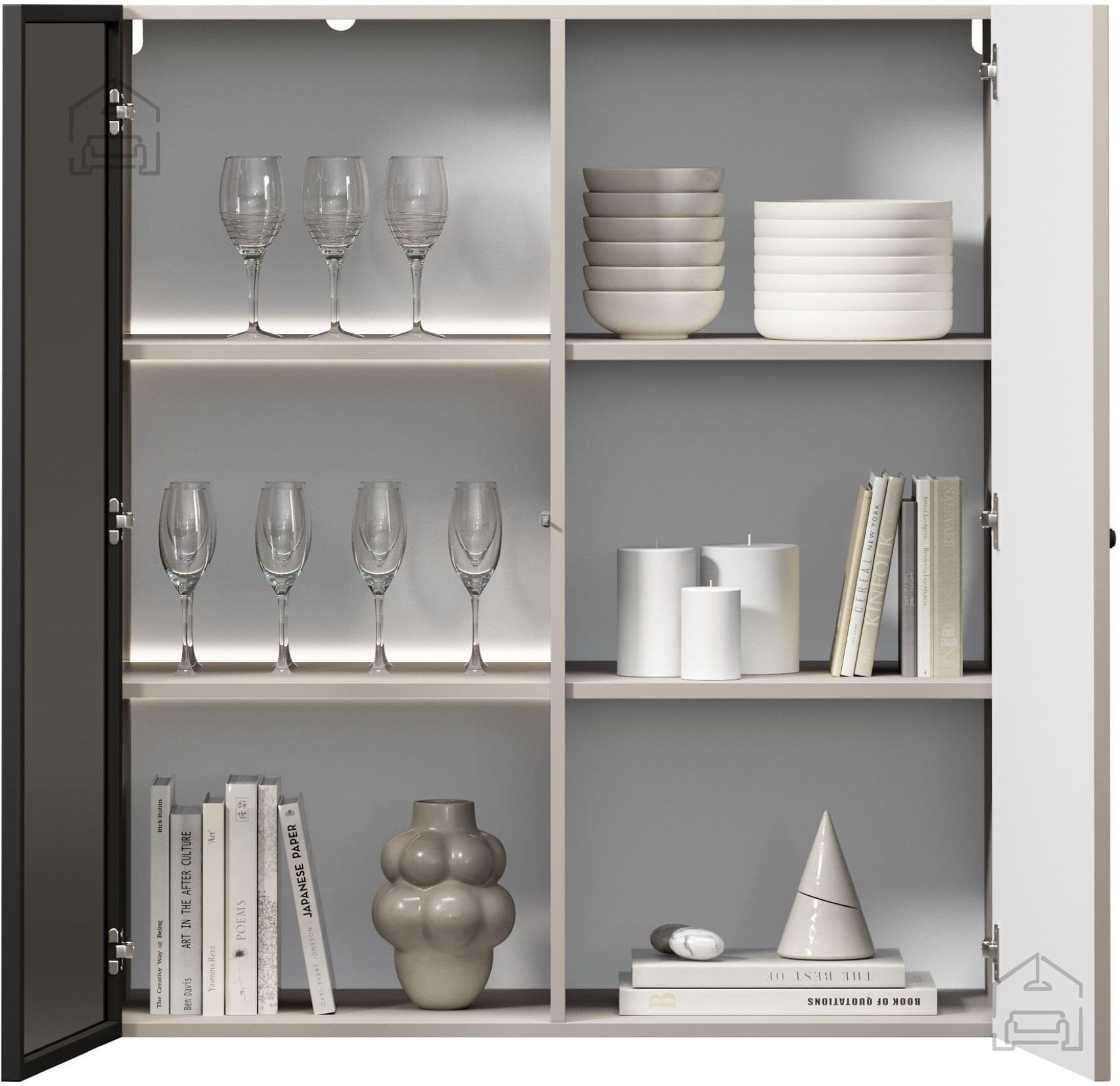 Stenska vitrina Lorini se lahko uporablja samostojno ali kot del večje sestave. Zaradi kompaktne višine in širine se prilega manjšim prostorom, hkrati pa ponuja dovolj prostora za shranjevanje. Idealna je za dnevne sobe, kjer lahko razstavite spominke, steklo ali knjige, pa tudi za jedilnice, kjer odlično služi kot omarica za posodo. Njena nevtralna barva omogoča kombiniranje z drugimi elementi kolekcije ali s pohištvom različnih proizvajalcev.