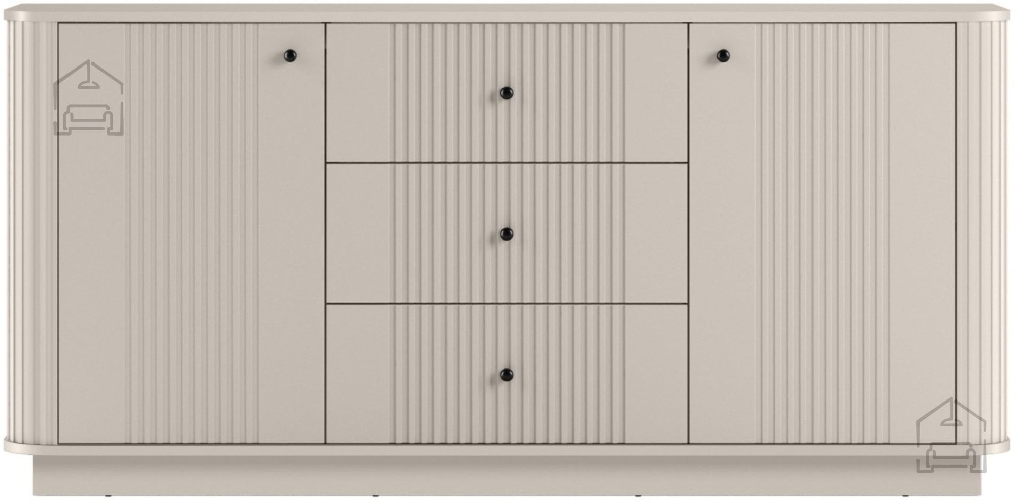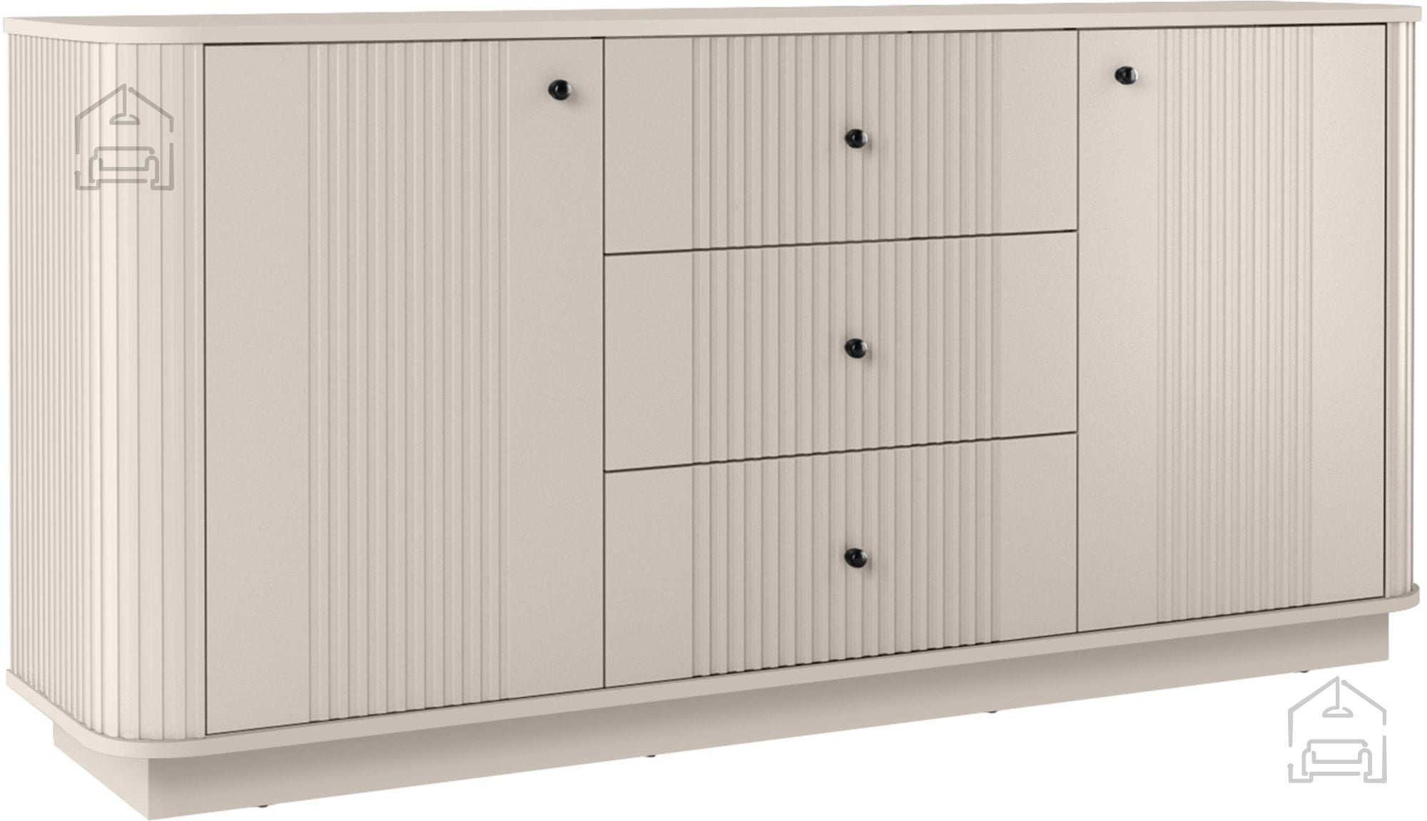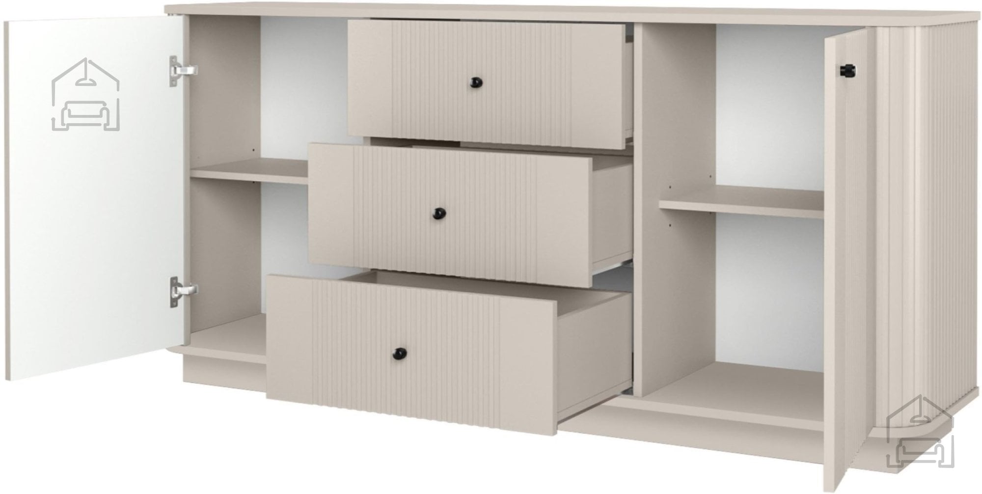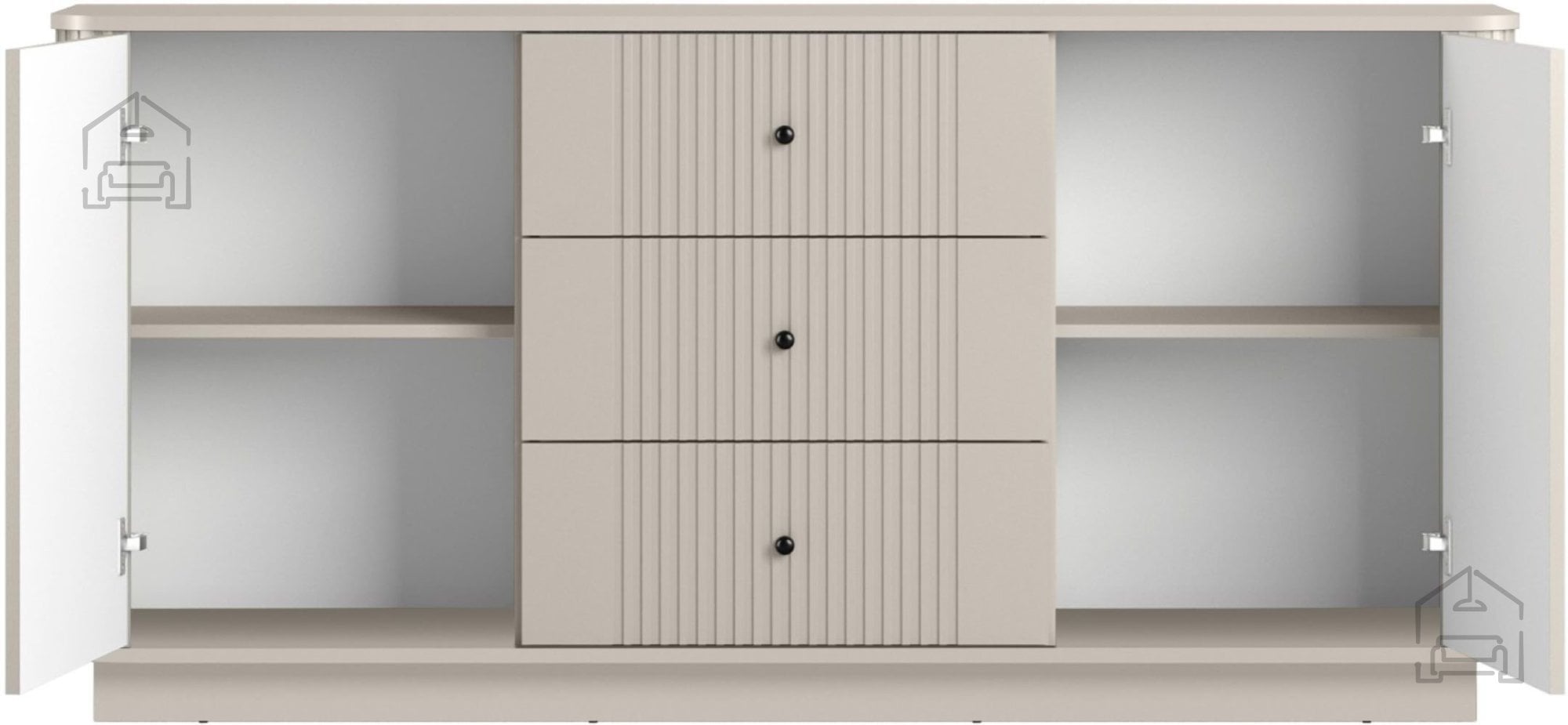 Vesper je zasnovana z mislijo na praktičnost in urejenost prostora. Komoda vključuje tri predale, dve omarici z vrati in dve polici. Ta kombinacija omogoča učinkovito organizacijo različnih predmetov – od tekstila do dokumentov ali dekorativnih dodatkov. Vrata in predali se odpirajo s pomočjo elegantnih kovinskih ročajev, ki so na voljo v dveh barvnih izvedbah: zlati ali črni. Tako lahko kupec izbere različico, ki se najbolje ujema z njegovim notranjim slogom.
