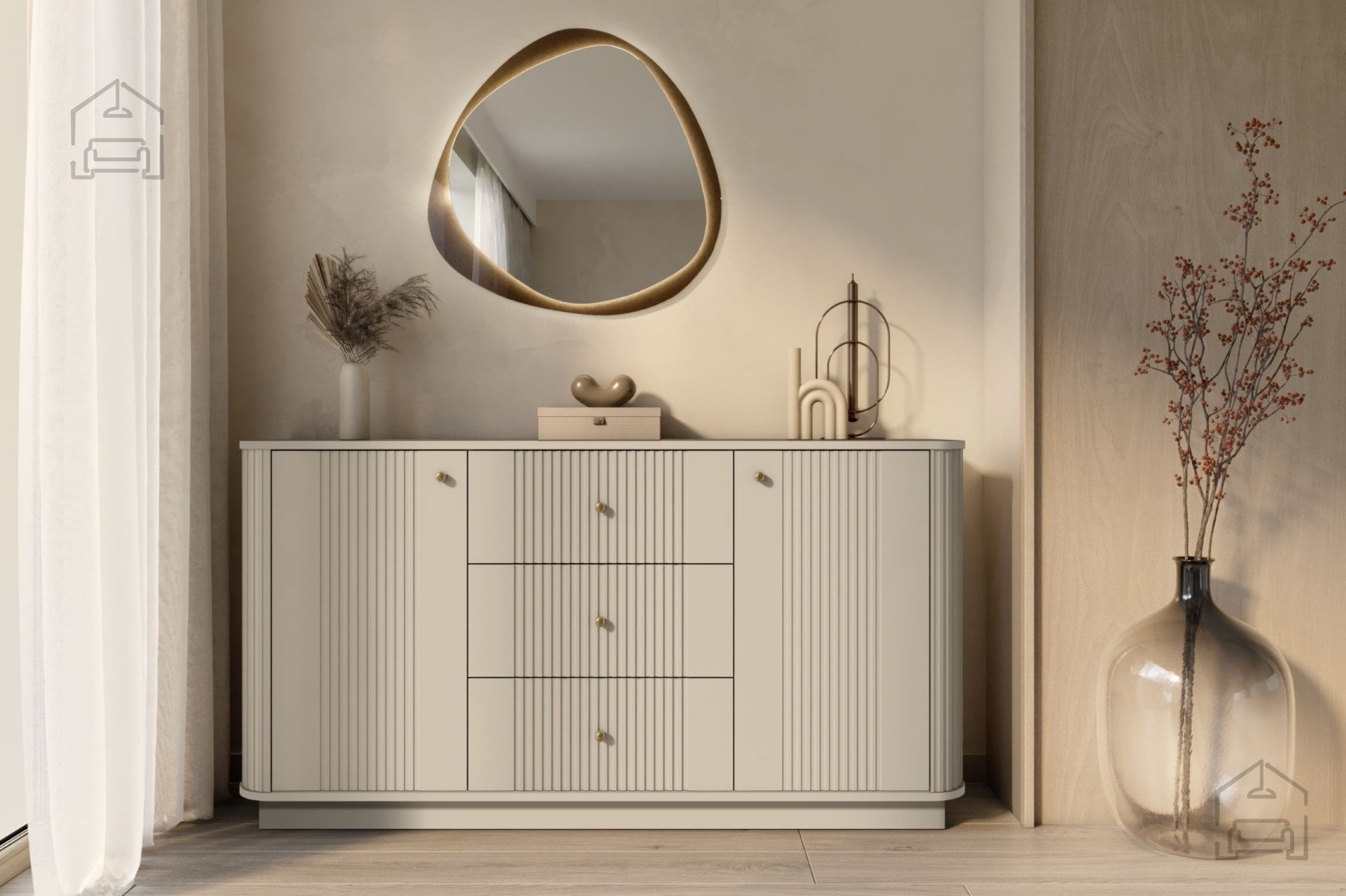 Barva kašmirja je nežna, nevtralna in topla, zato se komoda Vesper zlahka vključi v različne stile opreme – od skandinavskega minimalizma do sodobne elegance. Enotna barvna zasnova korpusa in front ustvarja občutek celovitosti in mirnosti, ki v prostoru deluje uravnoteženo in prijetno. Zlati ročaji dodajo pridih glamurja, medtem ko črni poudarijo kontrast in sodobnost.
