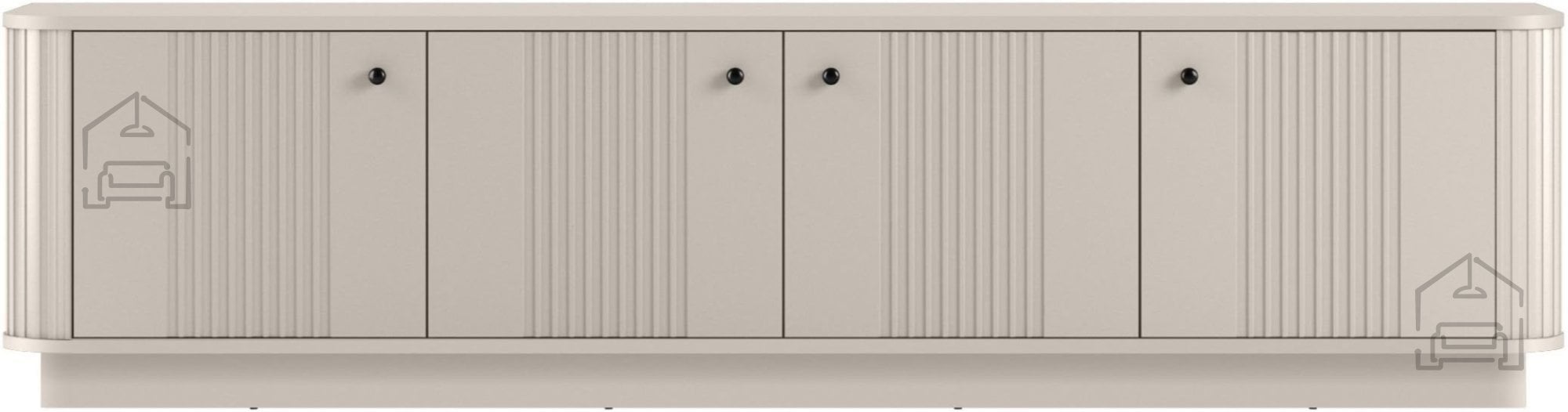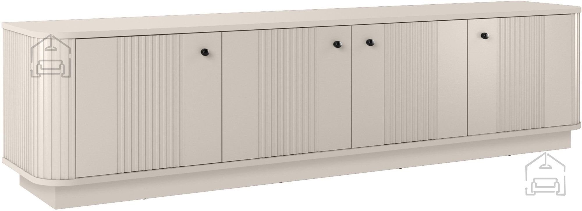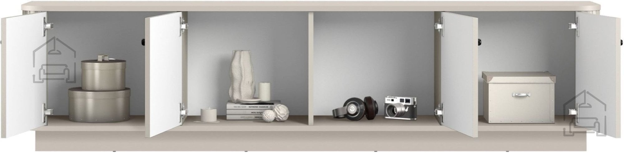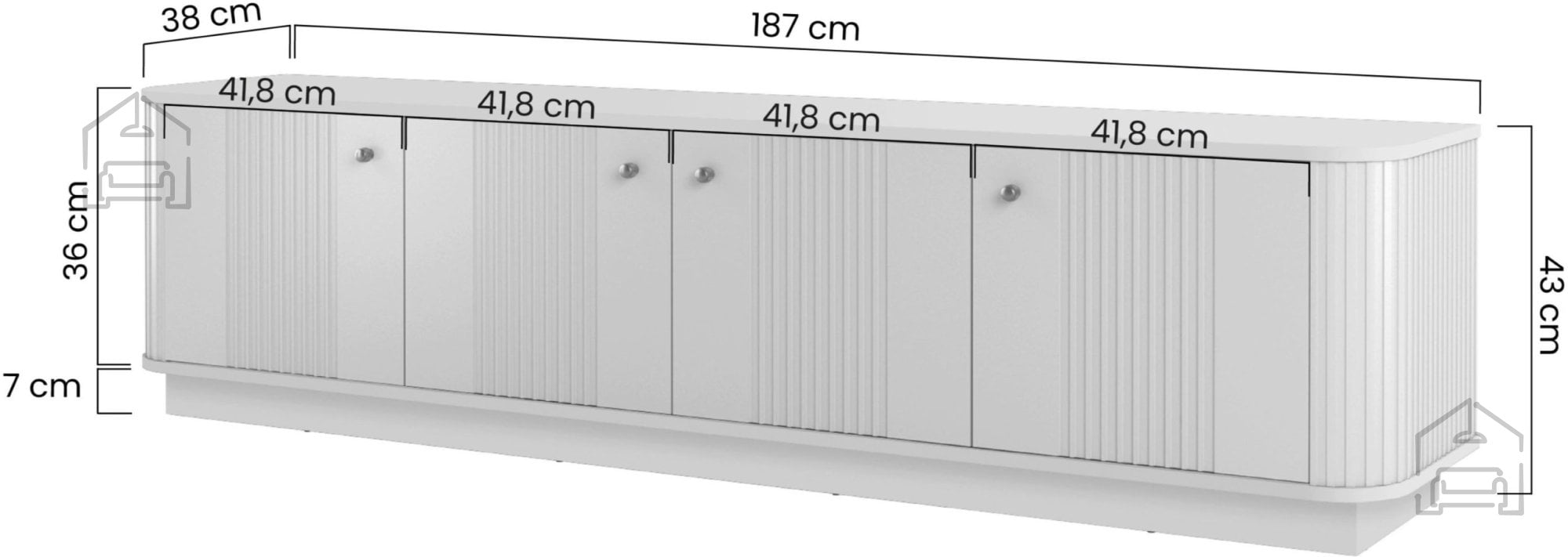 Komoda meri 187 × 38 × 43 cm, kar predstavlja optimalno razmerje med prostornino shranjevalnega prostora in vizualno uravnoteženostjo v dnevni sobi. Opremljena je s štirimi vrati (4D), za katerimi se skrivajo prostorni predelki za shranjevanje elektronskih naprav, kablov, filmov, knjig ali drugih dodatkov. Zaradi kompaktne višine je primerna tudi za postavitev televizorjev večjih dimenzij, pri čemer ostane zgornja plošča dovolj stabilna in ravna.