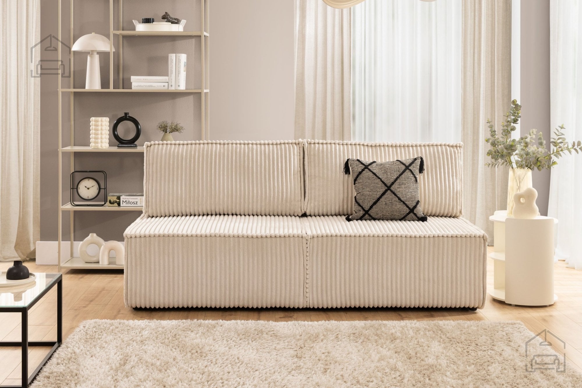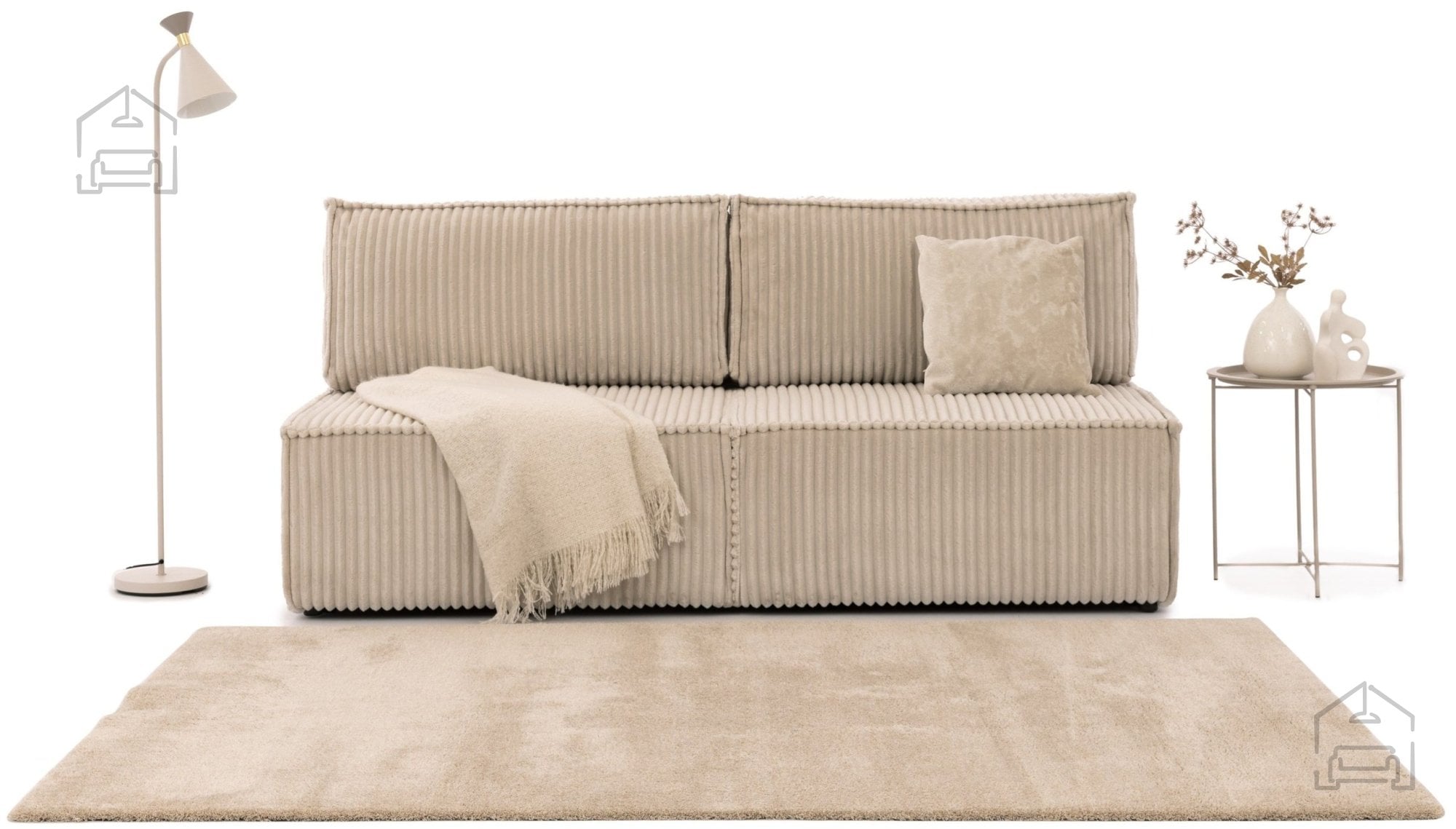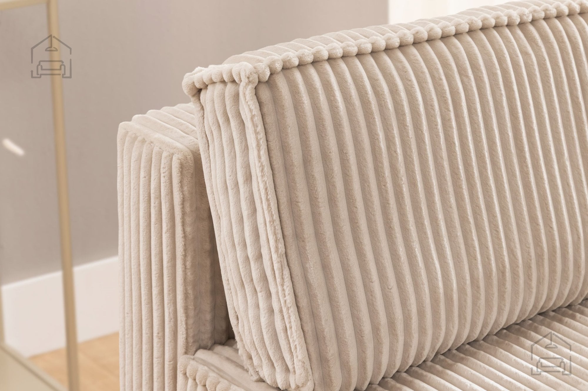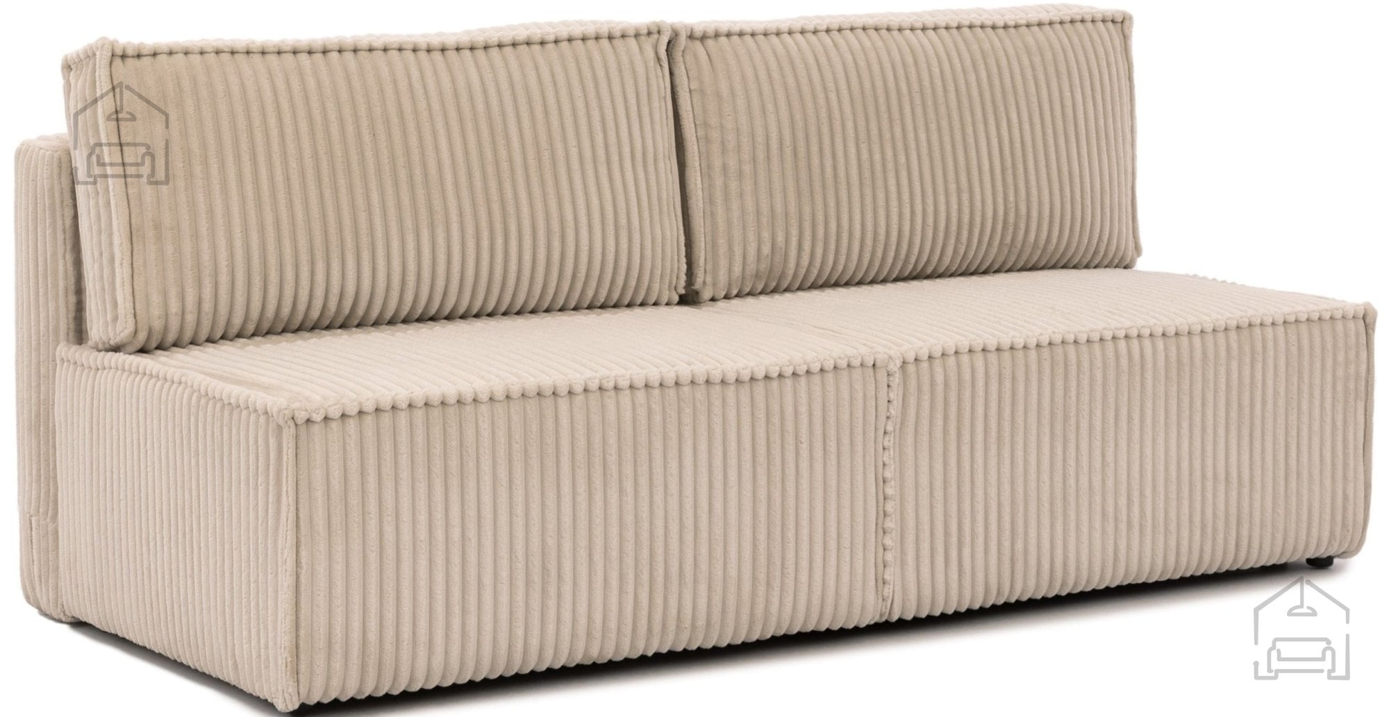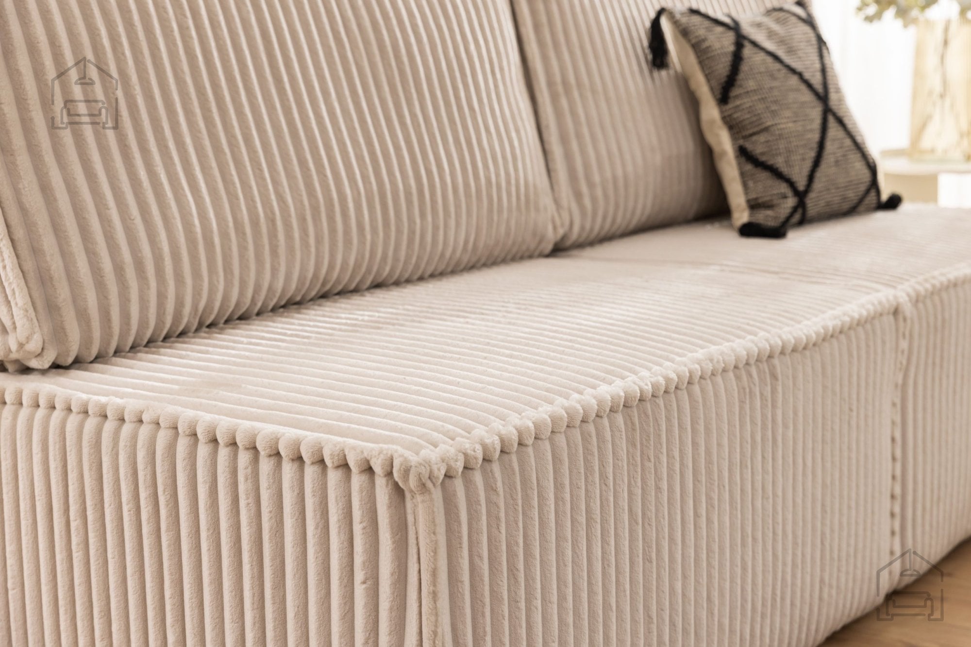 Za zunanjost troseda je uporabljena kakovostna tkanina, prijetna na dotik in primerna za vsakodnevno uporabo. Materiali so izbrani tako, da omogočajo enostavno vzdrževanje, kar je še posebej pomembno v družinskih domovih. Konstrukcijo dopolnjujejo črne plastične noge, visoke 3 cm, ki zagotavljajo stabilnost in hkrati omogočajo lažje čiščenje tal pod sedežno garnituro.