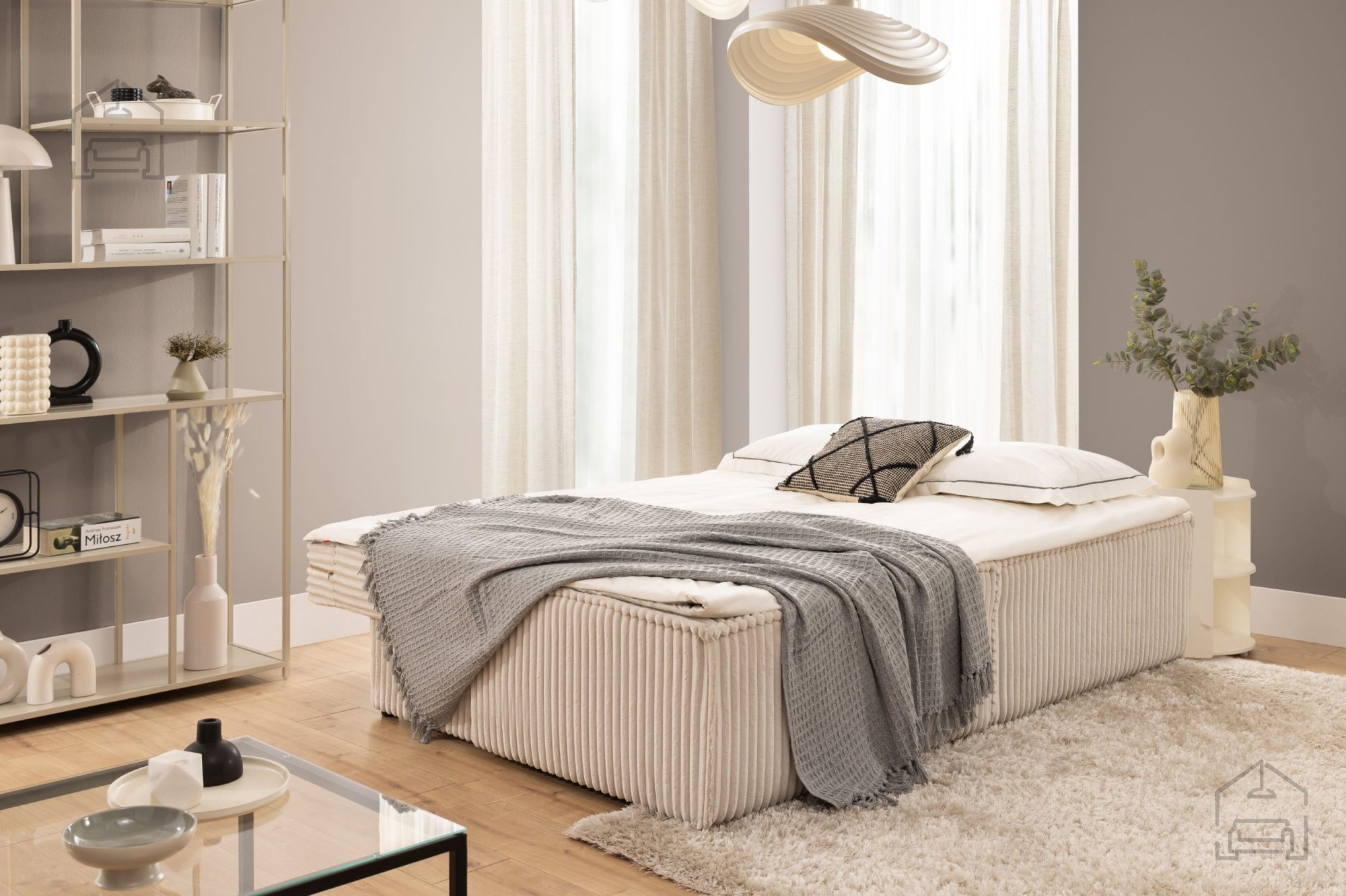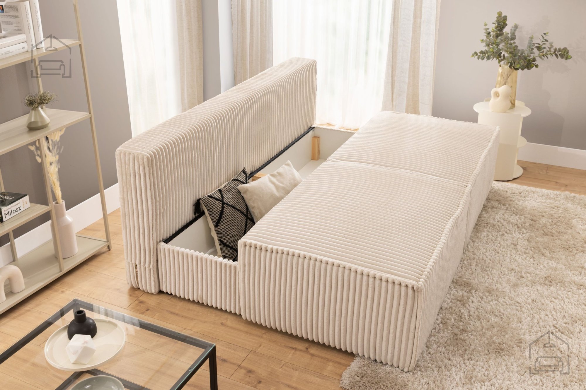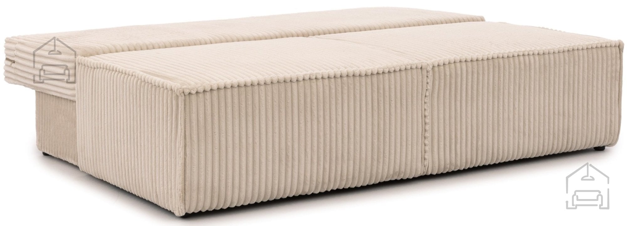 Trosed je dodatno opremljen s predalom za posteljnino, ki se nahaja pod sediščem. Ta praktična rešitev omogoča shranjevanje odej, blazin ali drugih tekstilnih dodatkov, kar pomaga ohranjati dnevni prostor urejen in prostoren.