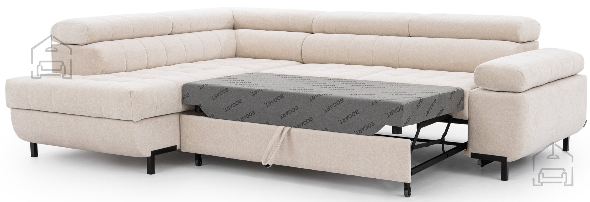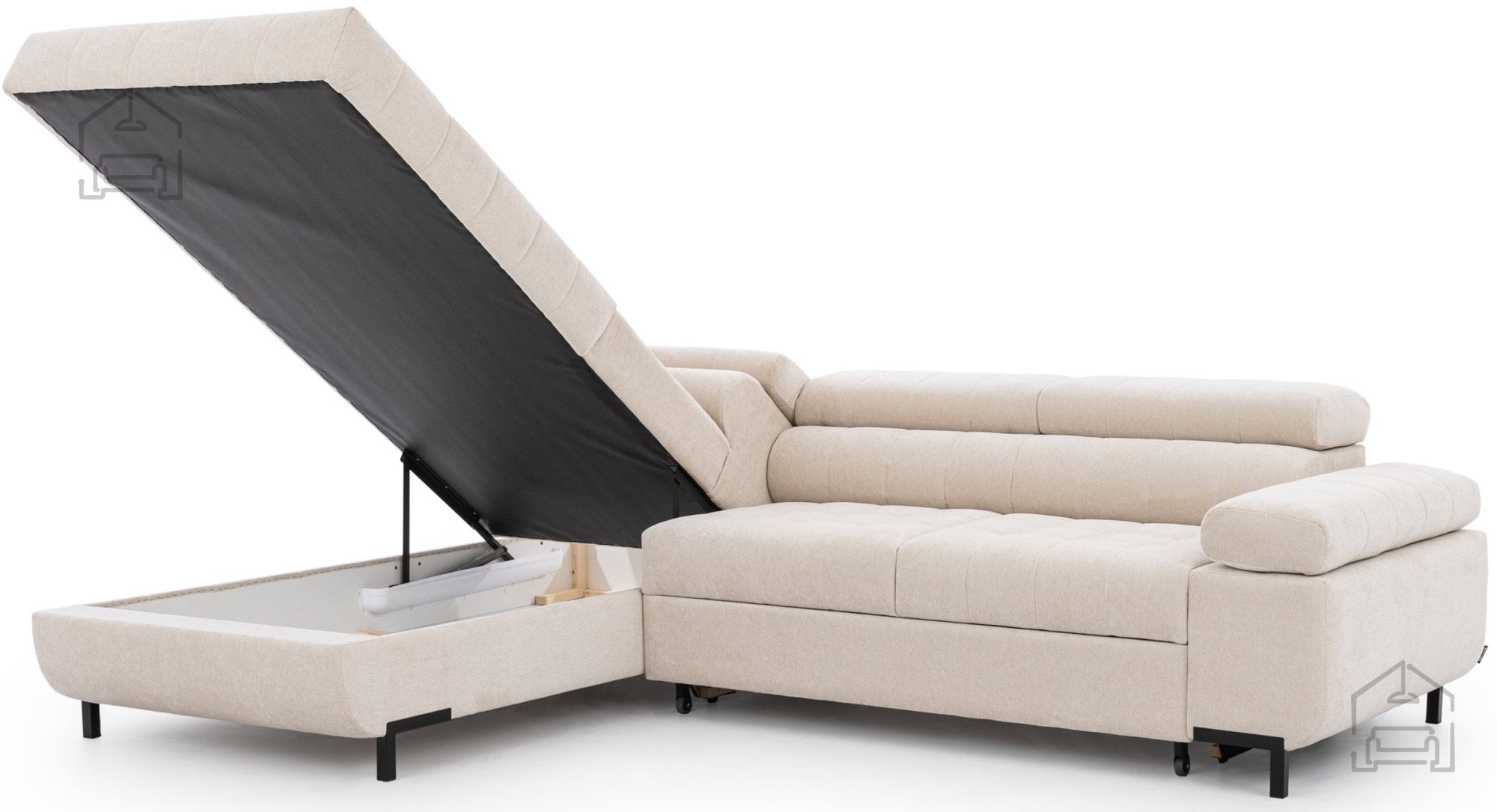 Poleg udobnega sedenja in možnosti raztega v ležišče garnitura vsebuje tudi prostoren predal za posteljnino, ki je diskretno vgrajen pod sediščem. Vanj lahko shranite odeje, blazine ali druge dodatke, kar pomaga ohranjati dnevno sobo urejeno in brez odvečnih predmetov. Mehanizem Dolphin omogoča hitro preoblikovanje iz kavča v posteljo, zato je Tyrion L idealna izbira za manjša stanovanja ali prostore, kjer želite združiti dnevni in spalni del.