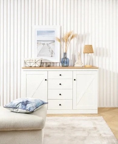 Kolekcija Frija poljskega proizvajalca Black Red White združuje svežino sodobnega skandinavskega oblikovanja z umirjenostjo naravnih barvnih tonov. Zasnovana je za tiste, ki želijo ustvariti prijeten, svetel in funkcionalen prostor, primeren tako za dnevni prostor kot za spalnico. Kombinacija odtenkov andersen belega bora in artisan hrasta ustvarja harmoničen kontrast med toplino lesa in čistino bele barve, kar prostoru doda občutek prostornosti in miru.