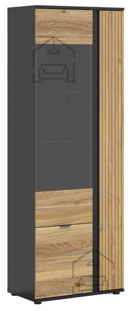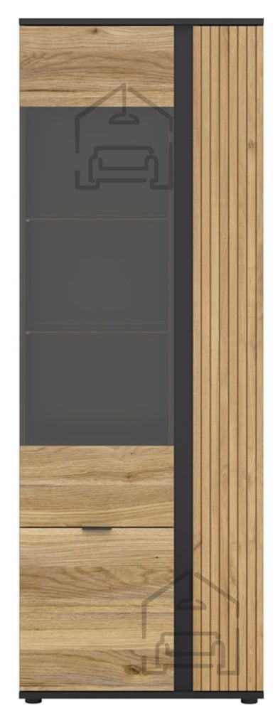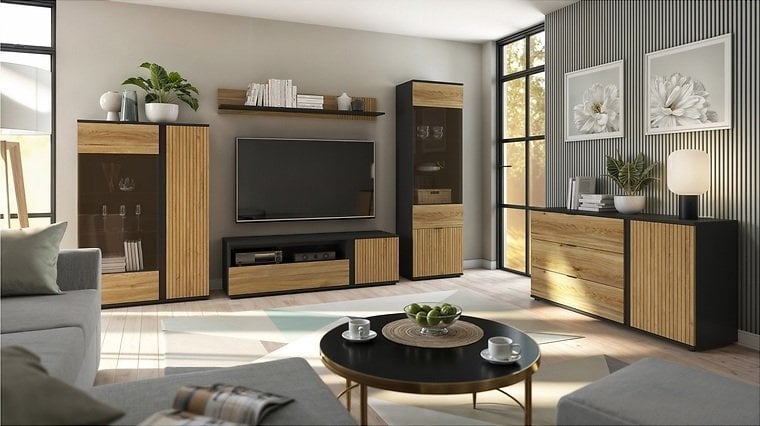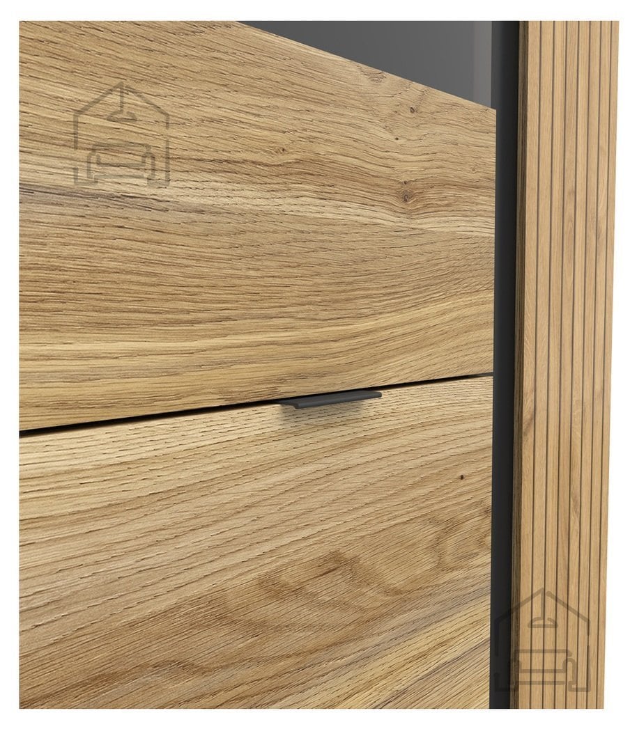 Kombinacija odtenkov hrasta Taegola in hrasta Mauvella z mat črnimi poudarki ustvarja kontrast, ki deluje sodobno, a hkrati naravno. Lesni ton poskrbi za toplino in prijeten občutek domačnosti, medtem ko črna barva poudari linije in strukturo vitrine. Takšna barvna usklajenost omogoča, da se kos zlahka vključi v različne interierje – od skandinavskih do industrijskih ali klasičnih.