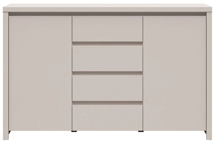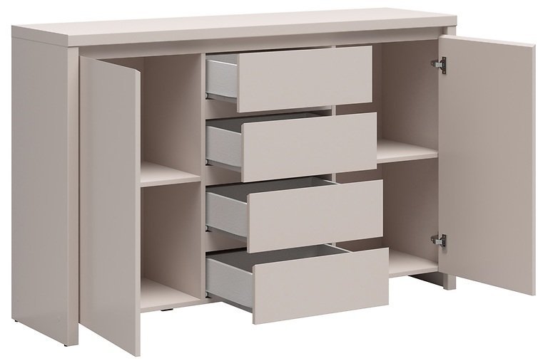 Komoda Kaspian ponuja premišljeno rešitev za shranjevanje. Opremljena je s štirimi predali in dvema omaricama, kar omogoča jasno ločevanje med različnimi vrstami predmetov. Predali so idealni za manjše kose oblačil, dodatke ali dokumente, medtem ko omarici nudita prostor za večje predmete, kot so posteljnina, knjige ali posoda. Takšna razporeditev omogoča učinkovito organizacijo in hkrati ohranja urejen videz prostora.