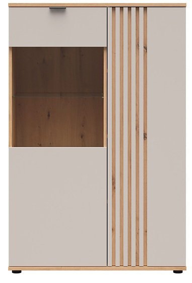 Ohišje in fronti vitrini sta izdelana iz laminirane plošče, kar zagotavlja trpežnost in enostavno čiščenje. Površina z učinkom hrast artisan posnema naravno teksturo lesa, zato pohištvo deluje toplo in domače. Elegantna barva kašmir pa vnese pridih sodobne prefinjenosti, ki se lepo ujema z različnimi barvnimi shemami interierja. Poseben dekorativni poudarek predstavljajo modne letvice iz MDF, s katerimi dobijo frontne površine dinamičen in sodoben videz.
