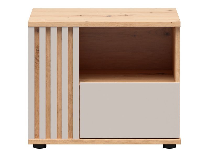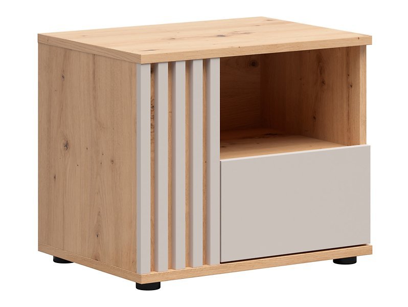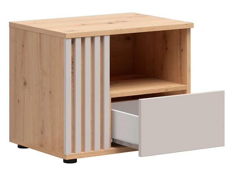 Motiv vertikalnih lamel iz MDF-letvic je eden najbolj prepoznavnih trendov sodobnega notranjega oblikovanja. Z njim nočna omarica Brevas prinaša občutek dinamike, teksture in topline, ki popestri vsako spalnico. Kombinacija gladkih površin v kašmirju in naravne teksture artisan hrasta ustvarja prijeten kontrast, ki se lepo poda tako k svetlim kot temnejšim tonom pohištva ali sten.