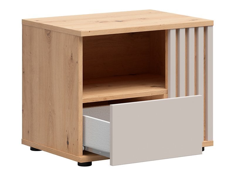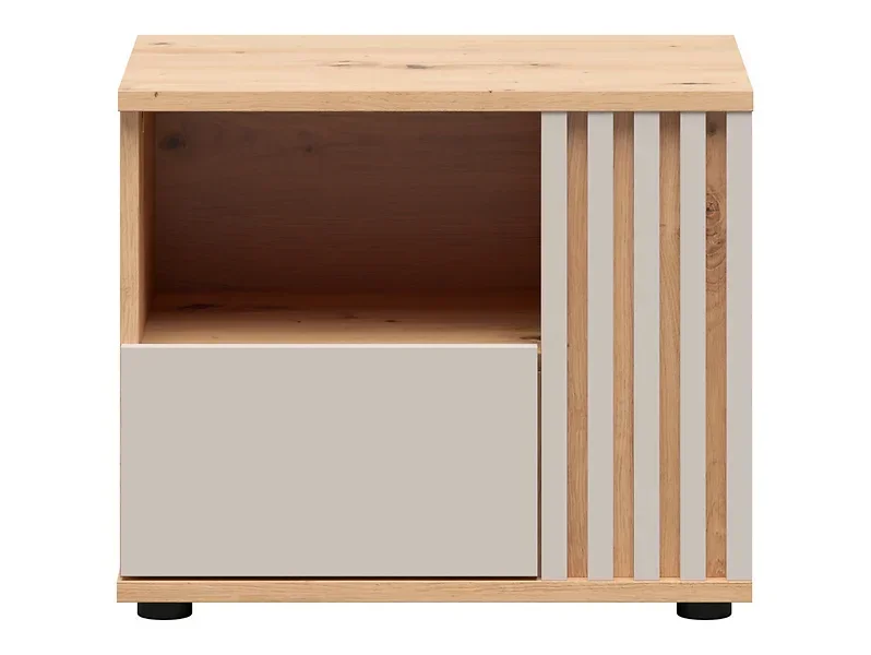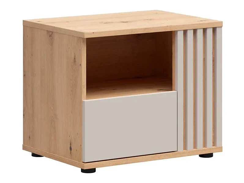 Nočna omarica Brevas desna je eleganten in funkcionalen kos pohištva, ki združuje sodobno estetiko s toplino naravnih dekorjev. S svojimi skrbno izbranimi materiali in premišljenimi razmerji je ustvarjena za tiste, ki cenijo urejen videz spalnice, hkrati pa potrebujejo praktičen prostor za shranjevanje ob postelji. Izdelana je iz robustne iverne plošče in oplemenitena z MDF letvicami, ki na fronti tvorijo lamelni motiv – ta daje kosu značaj in poudari njegov sodoben slog. Površina v odtenku kašmirja v kombinaciji z detajli v artisan hrastu v prostor vnese občutek miru in uravnoteženosti.