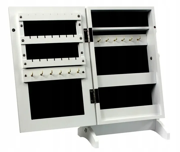 Notranjost omare je premišljeno organizirana, da omogoča pregledno shranjevanje različnih vrst nakita. Vgrajeni kavlji služijo za obešanje verižic in zapestnic, vdolbine so namenjene uhanom, medtem ko police ponujajo prostor za prstane, ure in druge drobne dodatke. Takšna razporeditev zagotavlja, da je vsak kos nakita na svojem mestu in zaščiten pred zapletanjem ali poškodbami. Magnetno zapiranje vratc omogoča enostavno odpiranje in zapiranje, hkrati pa preprečuje, da bi se omarica po nesreči odprla. To pomeni, da je primerna tudi za postavitev v manjših prostorih, kjer je varnost predmetov še posebej pomembna.