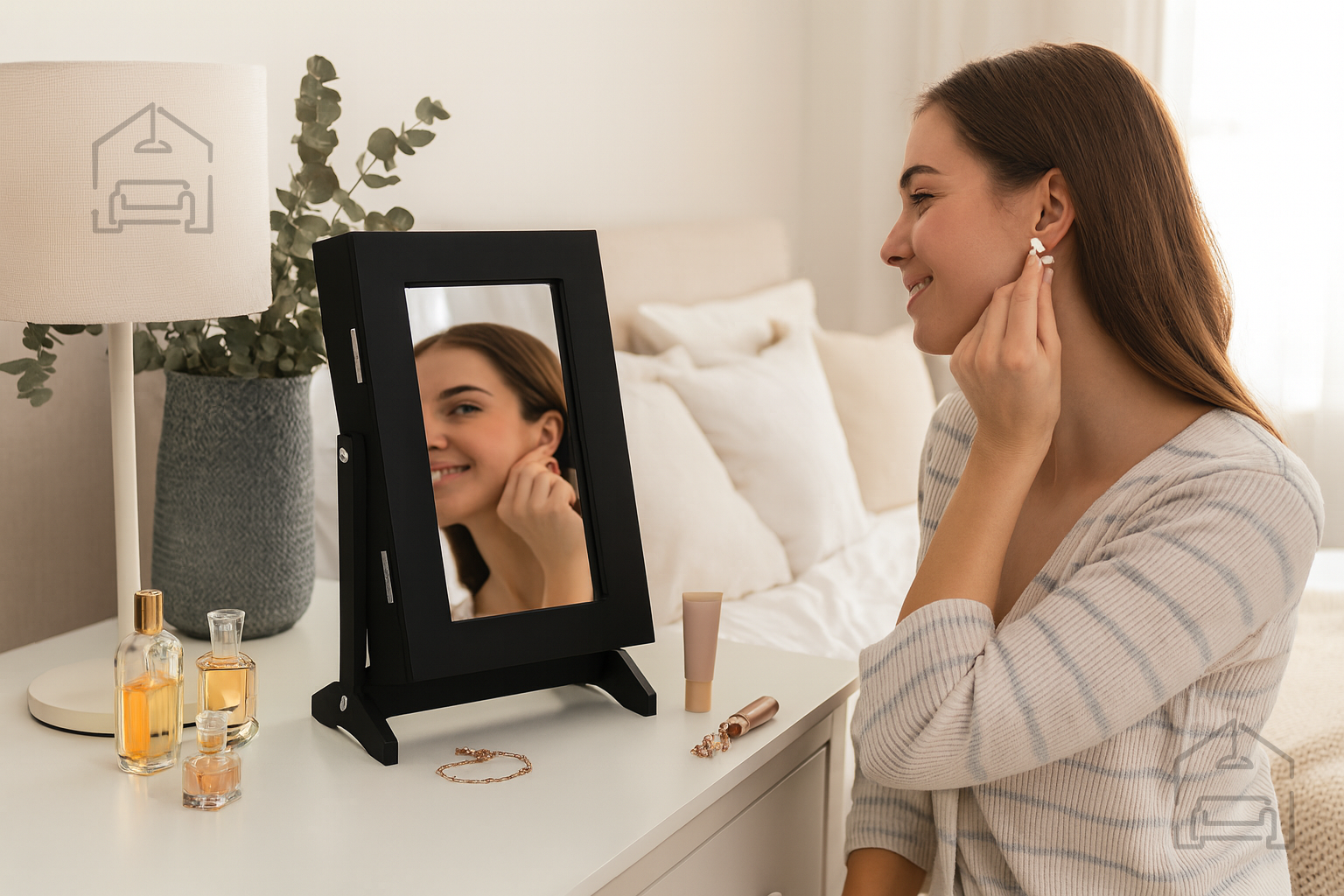 Vgrajeno ogledalo je eden izmed ključnih elementov, ki povečujejo uporabnost tega kosa pohištva. Omogoča hitro preverjanje videza ali pomerjanje nakita, ne da bi bilo treba zapustiti prostor. To je še posebej priročno pri jutranji pripravi ali večerni negi, ko potrebujete popolno osvetlitev in dostop do vseh svojih dodatkov.