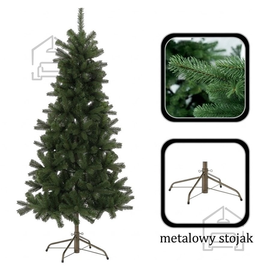 Izdelana v tovarni Chomik iz kakovostnih umetnih materialov, smreka zagotavlja dolgo življenjsko dobo in trajno obstojnost barv. Zelena površina vejic je oblikovana tako, da ustvarja naraven kontrast med temnejšimi in svetlejšimi odtenki, kar dodatno prispeva k realističnemu učinku. Uporabljeni materiali so odporni na deformacije in omogočajo, da smreka ohrani svojo obliko tudi po več letih uporabe.