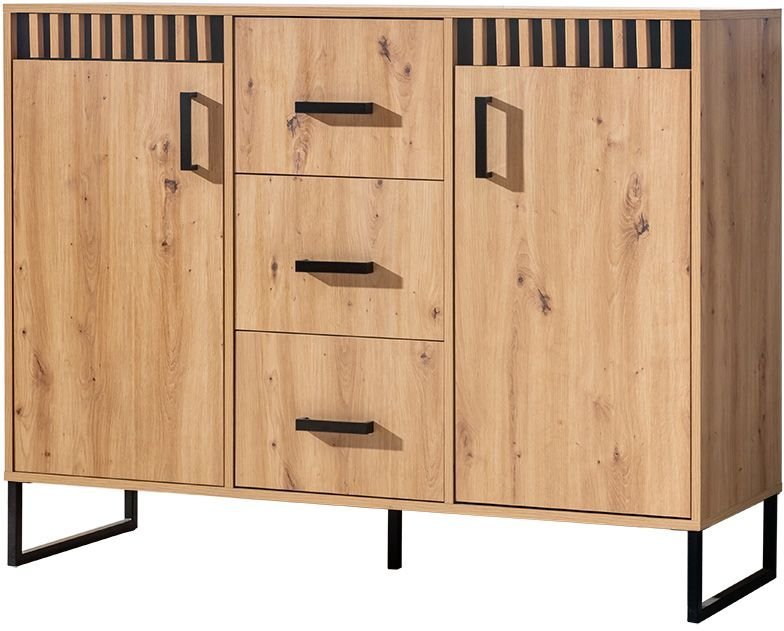 Odtis hrasta artisan se odlikuje po toplih zlatorjavih tonih in vidnih vzorcih lesa, ki prostoru dodajo naraven, domač občutek. Takšna barva je vsestranska in se odlično ujema z nevtralnimi stenami ali kontrastnimi temnimi površinami. Komoda Lamelix 05 tako deluje kot harmoničen element notranje opreme, ki ga lahko dopolnite s kovinskimi, črnimi ali mat belimi dodatki.