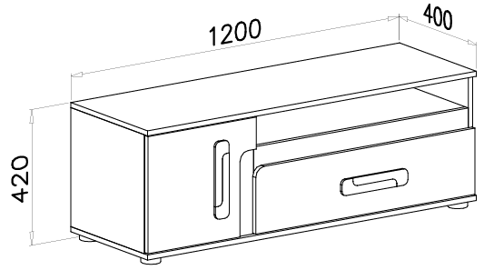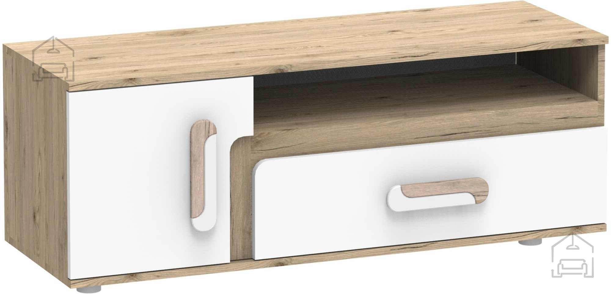 Dimenzije komode znašajo 120×40×42 cm, kar omogoča optimalno razporeditev prostora pod televizorjem. Na zgornjo površino lahko postavite televizor, dekorativne elemente ali elektronske naprave, medtem ko notranji predali in police omogočajo shranjevanje multimedijskih naprav, daljincev, kablov ali drugih dodatkov. Predali so opremljeni z zanesljivimi krogelnimi vodili, ki omogočajo gladko in tiho odpiranje ter zapiranje. Ročaji so izdelani iz sintetičnega materiala v kombinaciji bele in svetlo hrastove barve, kar dopolnjuje celoten videz komode in olajša vsakodnevno uporabo.