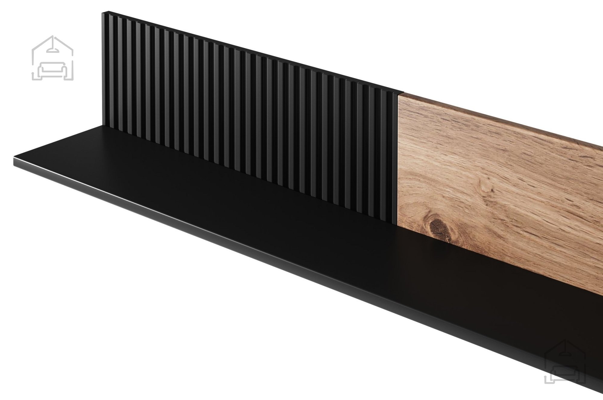 Polica je izdelana iz laminiranega MDF, materiala, ki je znan po svoji odpornosti in enostavnem vzdrževanju. Laminirana površina preprečuje vpijanje vlage in omogoča hitro čiščenje z vlažno krpo. Površina v barvi hrasta votan posnema naravno teksturo lesa, črna podlaga pa doda pridih industrijskega videza, kar skupaj ustvari prepoznaven sodoben kontrast. Takšna kombinacija je odlična izbira za notranje prostore, kjer se prepletata toplina lesa in eleganca temnih tonov.