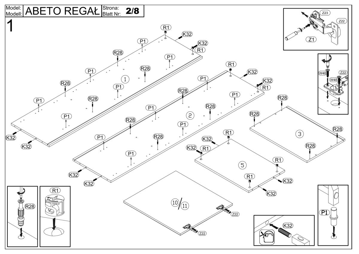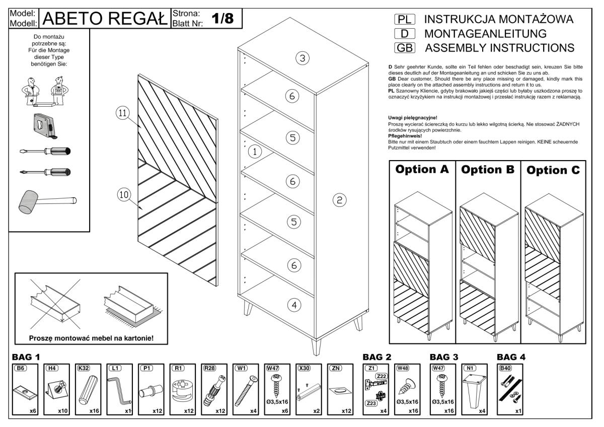 Regal Aveto stoji na črnih plastičnih nogah, ki mu zagotavljajo stabilnost in zaščito talnih oblog. Plastični material nog je odporen na vlago in enostaven za čiščenje, kar je pomembno predvsem pri vsakodnevni uporabi. Konstrukcija regala omogoča enostavno sestavljanje, pri čemer so vsi elementi natančno prilagojeni. Zaradi premišljene zasnove je regal primeren tako za dnevne sobe kot za spalnice, predsobe ali pisarne.