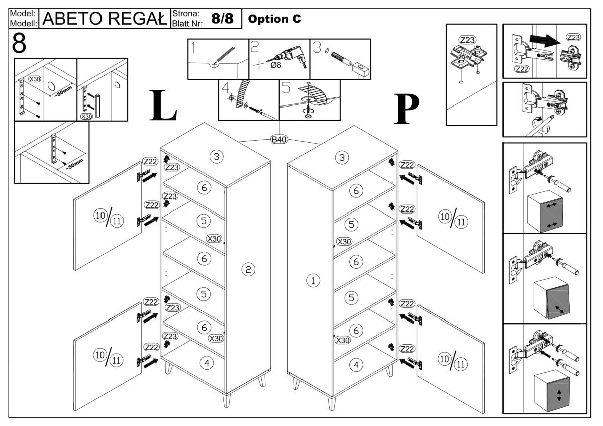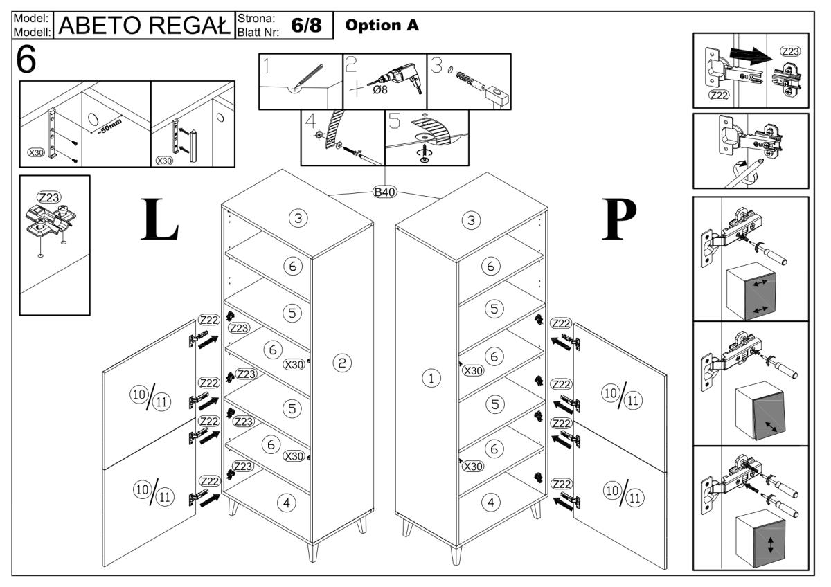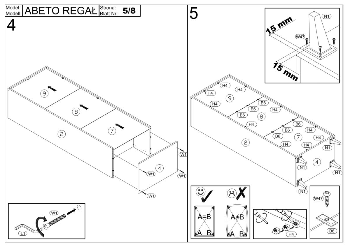 Regal Aveto je zasnovan tako, da omogoča preprosto čiščenje in vzdrževanje. Laminirane površine se zlahka obrišejo z mehko, rahlo vlažno krpo, brez uporabe agresivnih čistil. PVC folija na frontnih ploščah ohranja svoj sijaj tudi po dolgotrajni uporabi, ABS robovi pa preprečujejo krušenje in vdor vlage v notranjost materiala. Plastične noge omogočajo stabilno postavitev na različnih vrstah tal, od parketa do ploščic, pri tem pa ne puščajo sledi.
