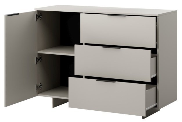 Barva kašmir daje komodi mehak, topel videz, ki se odlično ujema z nevtralnimi, pastelno obarvanimi ali kontrastno temnimi notranjostmi. Enostavne linije in čisti robovi ustvarjajo minimalističen videz, ki se lepo dopolnjuje z drugimi kosi pohištva v sodobnih ali skandinavskih interierjih. Komoda se ponaša z estetsko uravnoteženim razmerjem med predali in vrati, kar dodatno prispeva k vizualni harmoniji prostora.