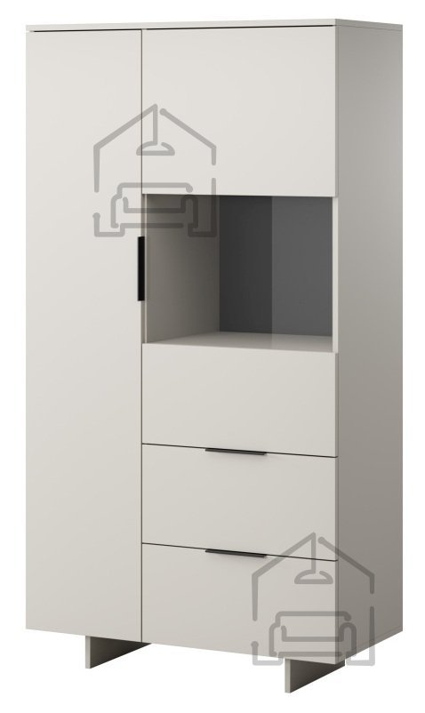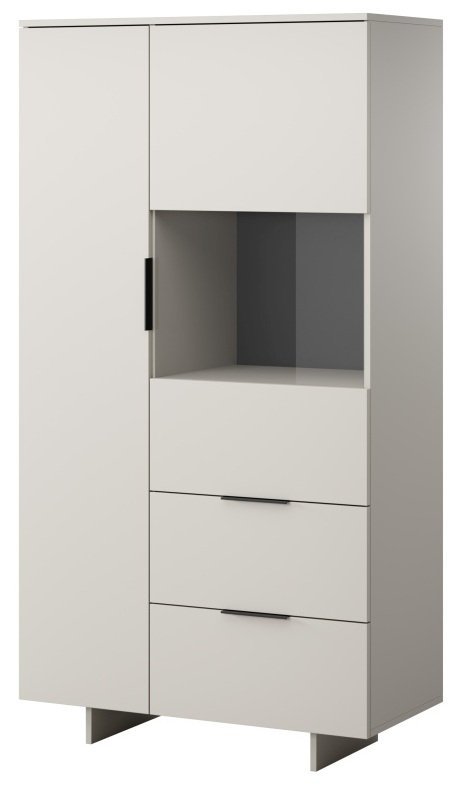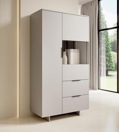 Barva kašmir daje vitrini topel, a sodoben značaj, ki se lepo zlije z različnimi barvnimi kombinacijami notranje opreme. Površina je gladka in enostavna za čiščenje, zato bo vitrina dolgo ohranila svoj prvotni videz. Enostavne linije dopolnjujejo črni ročaji HEXI 150, ki ustvarjajo diskreten kontrast in poudarijo sodobno estetiko. Ti detajli omogočajo, da se model Alma lepo poda tako v dnevno sobo kot v jedilnico ali hodnik.