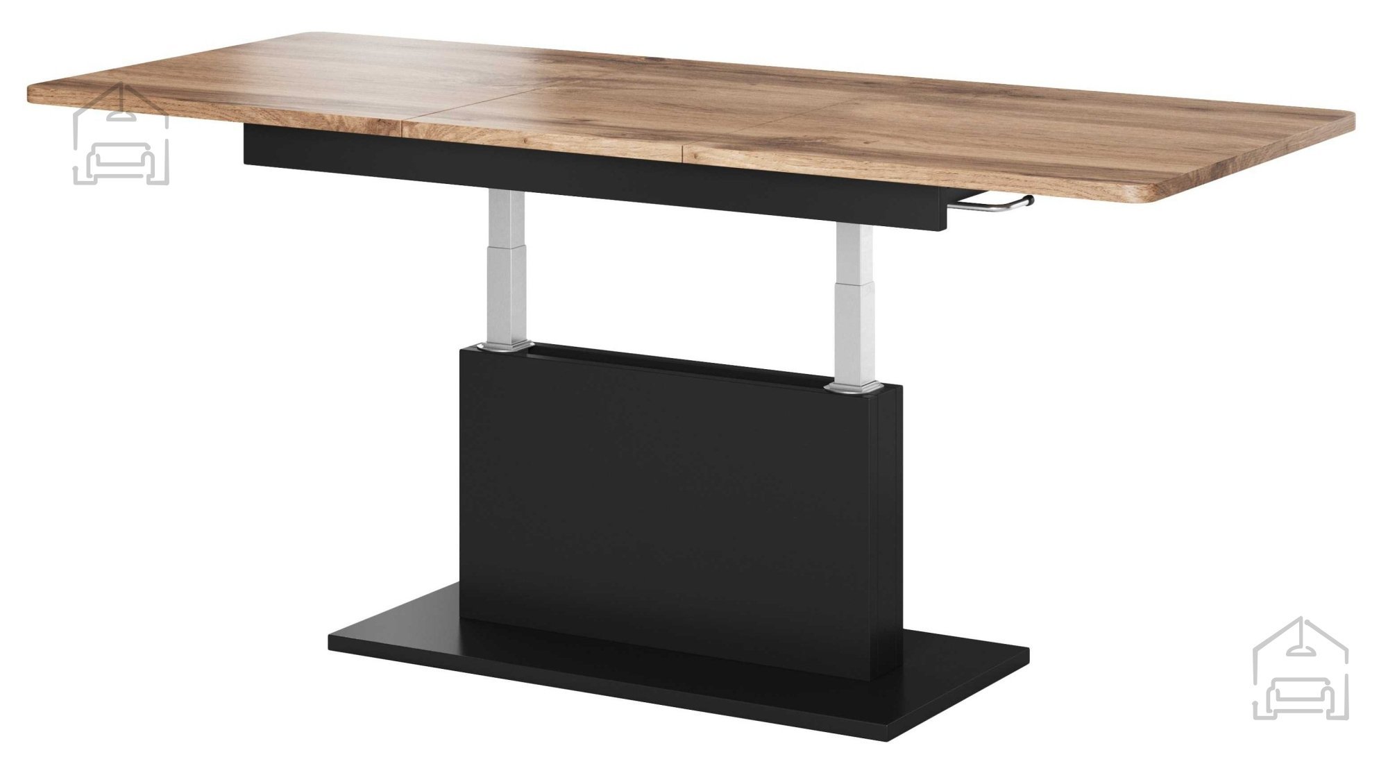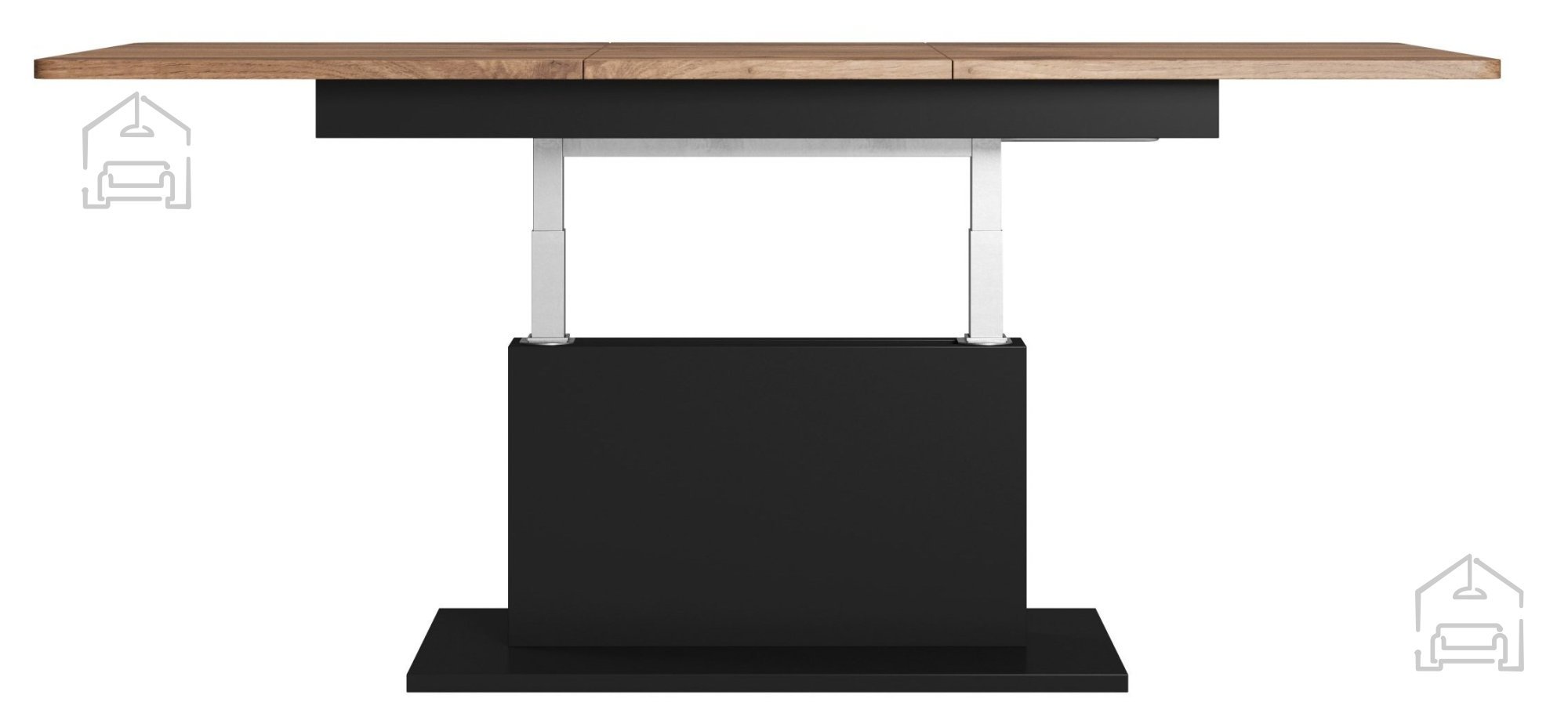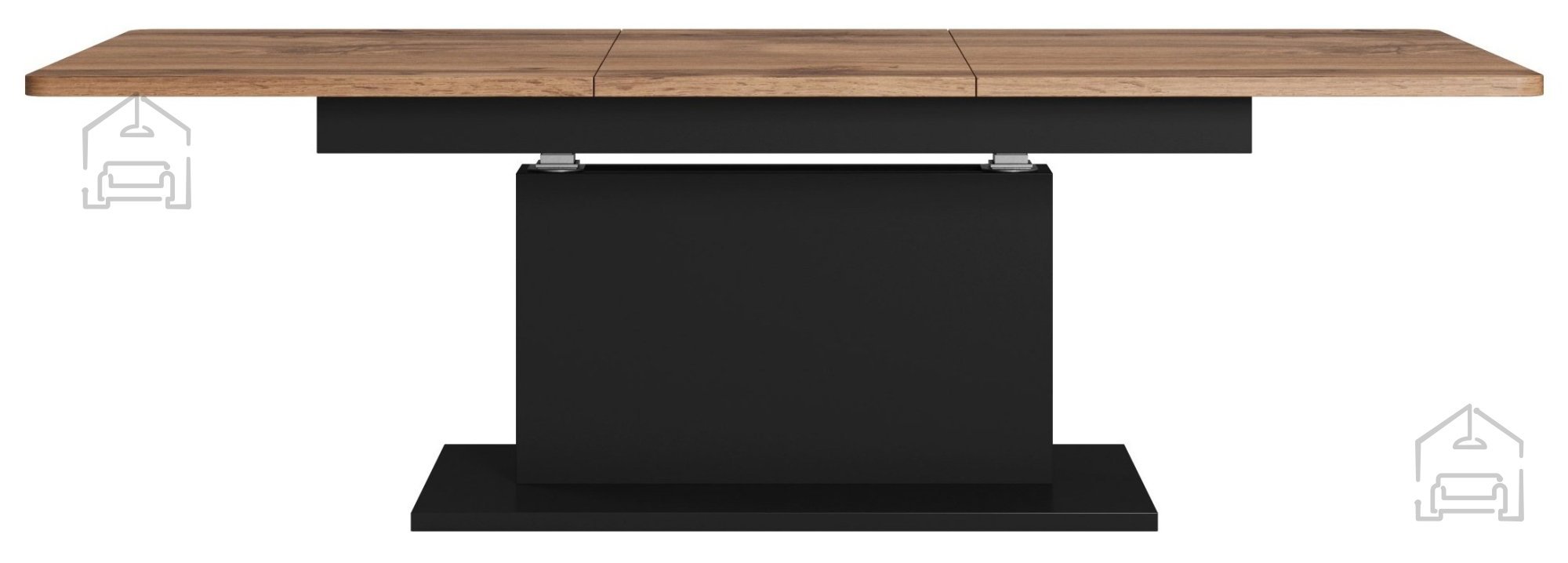 Osnovne dimenzije mize znašajo 167 × 70 × 74 cm, raztegljiv mehanizem pa omogoča razpon od 126 do 167 cm v dolžino, širino 70 cm in nastavljivo višino med 56 in 74 cm. Takšna prilagodljivost omogoča, da se miza popolnoma prilega različnim potrebam – kot klubska miza ob kavču ali kot razširjena površina za obroke in druženje. Mehanizem je stabilen in enostaven za uporabo, kar zagotavlja zanesljivo delovanje tudi ob pogosti uporabi.