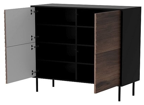 Barvna izvedba v črni in orehovi barvi prinaša eleganco in toplino. Črna barva poudarja sodobnost in minimalizem, medtem ko orehov dekor dodaja naravni pridih in občutek domačnosti. Takšna kombinacija se lepo ujema z drugimi lesenimi ali kovinskimi elementi v prostoru in omogoča enostavno vključitev v obstoječo notranjo opremo. Komoda Cortina izstopa kot osrednji estetski element, ki kljub svoji preprostosti pritegne pozornost.