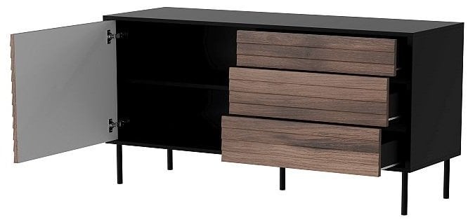 Črna barva v kombinaciji z naravnim tonom oreha ustvarja prepoznaven estetski vtis, ki se lepo ujema tako z modernimi kot z industrijsko obarvanimi interierji. Lesni dekor oreha doda občutek topline, črna površina pa poskrbi za eleganco in vizualno globino. Takšna kombinacija omogoča, da se komoda ujemajoče vključi v dnevne sobe, spalnice ali hodnike, lahko pa služi tudi kot poudarek v minimalistično zasnovanem prostoru.
