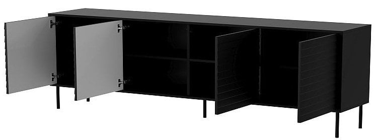Komoda Cortina 200 cm 4D – Halmar je popolna izbira za tiste, ki želijo združiti estetsko dovršenost s praktično uporabnostjo. Njena moderna oblika, kakovostni materiali in premišljene podrobnosti ustvarjajo kos pohištva, ki bo dolgo časa obogatil vaš dom. Črna barva in kovinske noge poskrbijo za sodoben videz, medtem ko prostoren notranji del ponuja vse, kar potrebujete za urejen in pregleden prostor.