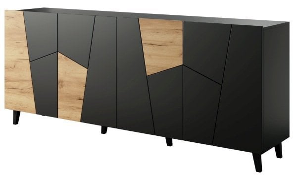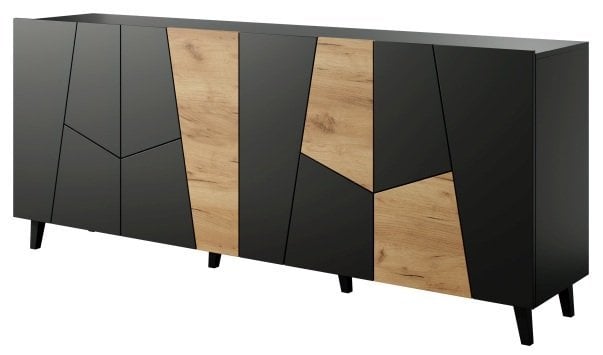 Komoda Etna – Halmar združuje sodoben dizajn, praktičnost in kontrastno barvno kombinacijo črne z odtenkom hrasta craft. Njena uravnotežena širina 200 cm, globina 42 cm in višina 82 cm omogočajo, da se popolnoma vključi tako v dnevne prostore kot v spalnice ali predsobe. S preprosto linijo brez klasičnih ročajev in s frontami, ki segajo nad zgornjo ploščo, komoda ustvarja minimalistični videz, ki poudarja naravno teksturo lesa in elegantno mat črnino.