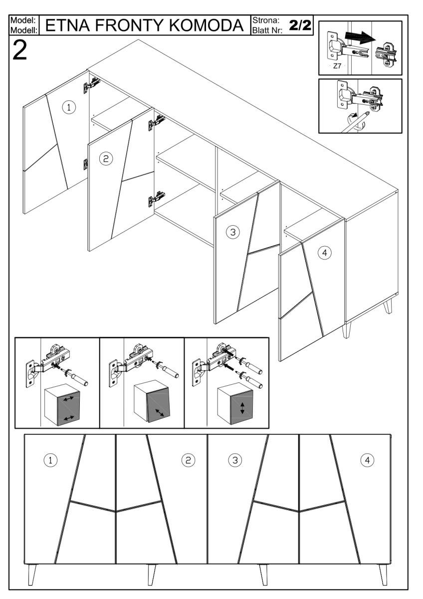Komoda Etna je zasnovana brez vidnih ročajev – fronte se rahlo dvigajo nad zgornjo ploščo, kar omogoča udobno odpiranje in hkrati ohranja čist, neprekinjen videz. Takšna zasnova se odlično ujema s trendi minimalistične notranje opreme, kjer prevladujejo čiste linije in umirjene barvne kombinacije. Prostorne notranje komore nudijo dovolj prostora za shranjevanje oblačil, dokumentov ali gospodinjskih predmetov, zato komoda ni le estetski, temveč tudi praktičen kos pohištva.