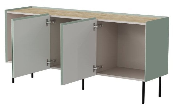 Komoda je izdelana iz 16 mm debele lakirane MDF plošče in 16 mm iverne plošče, kar zagotavlja stabilnost in dolgo življenjsko dobo. Lakirana površina je gladka in odporna proti obrabi, hkrati pa enostavna za čiščenje. Zgornja plošča je rahlo prekrita s frontami, kar poudari brezročajni dizajn in daje pohištvu čisto, enotno linijo. Kovinske noge v črni barvi, visoke 20 cm, ustvarjajo kontrast z olivnim tonom ter omogočajo enostavno čiščenje tal pod komodo.