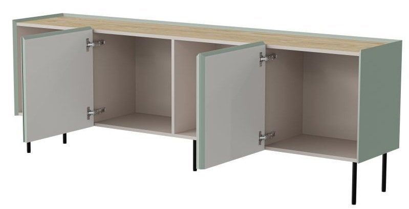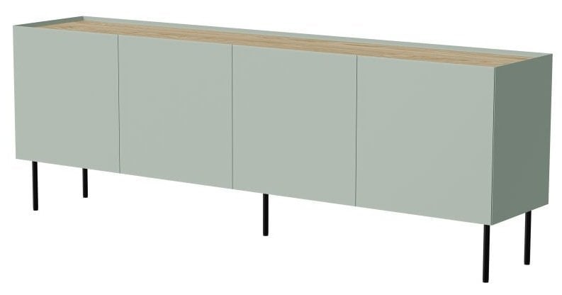 Komoda Fellini 200 cm – Halmar je sodoben kos pohištva, ki združuje funkcionalnost, estetiko in trdnost. Z dolžino 200 cm, globino 40 cm in višino 70 cm ponuja prostorno shranjevalno površino, ki se odlično ujema z različnimi interierji. Njena barvna kombinacija zelene in imitacije naoljenega hrasta ustvarja topel, a hkrati sodoben vtis, primeren tako za dnevne sobe kot za jedilnice ali predsobe.