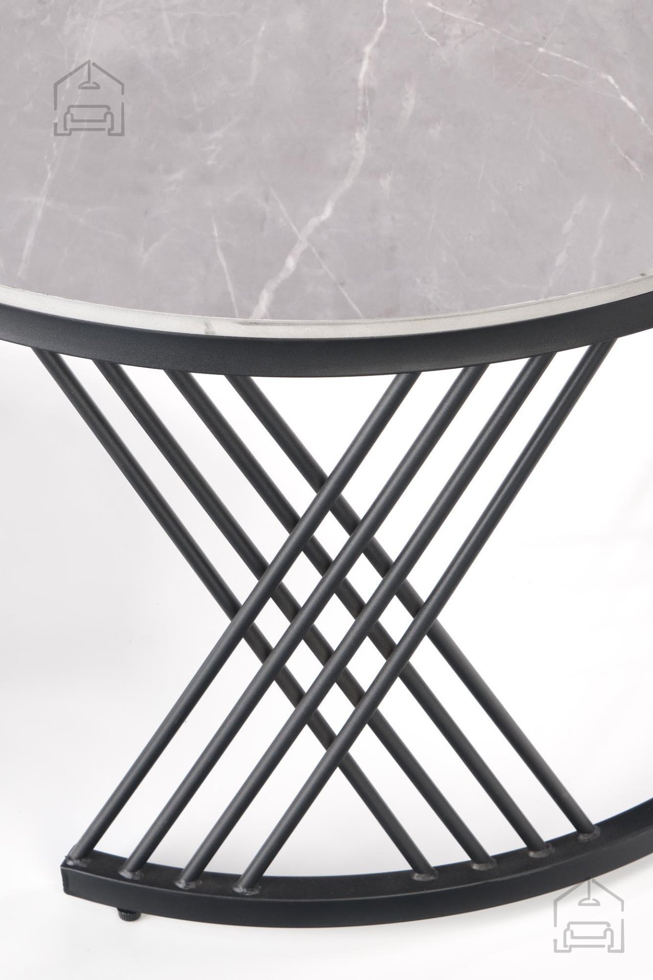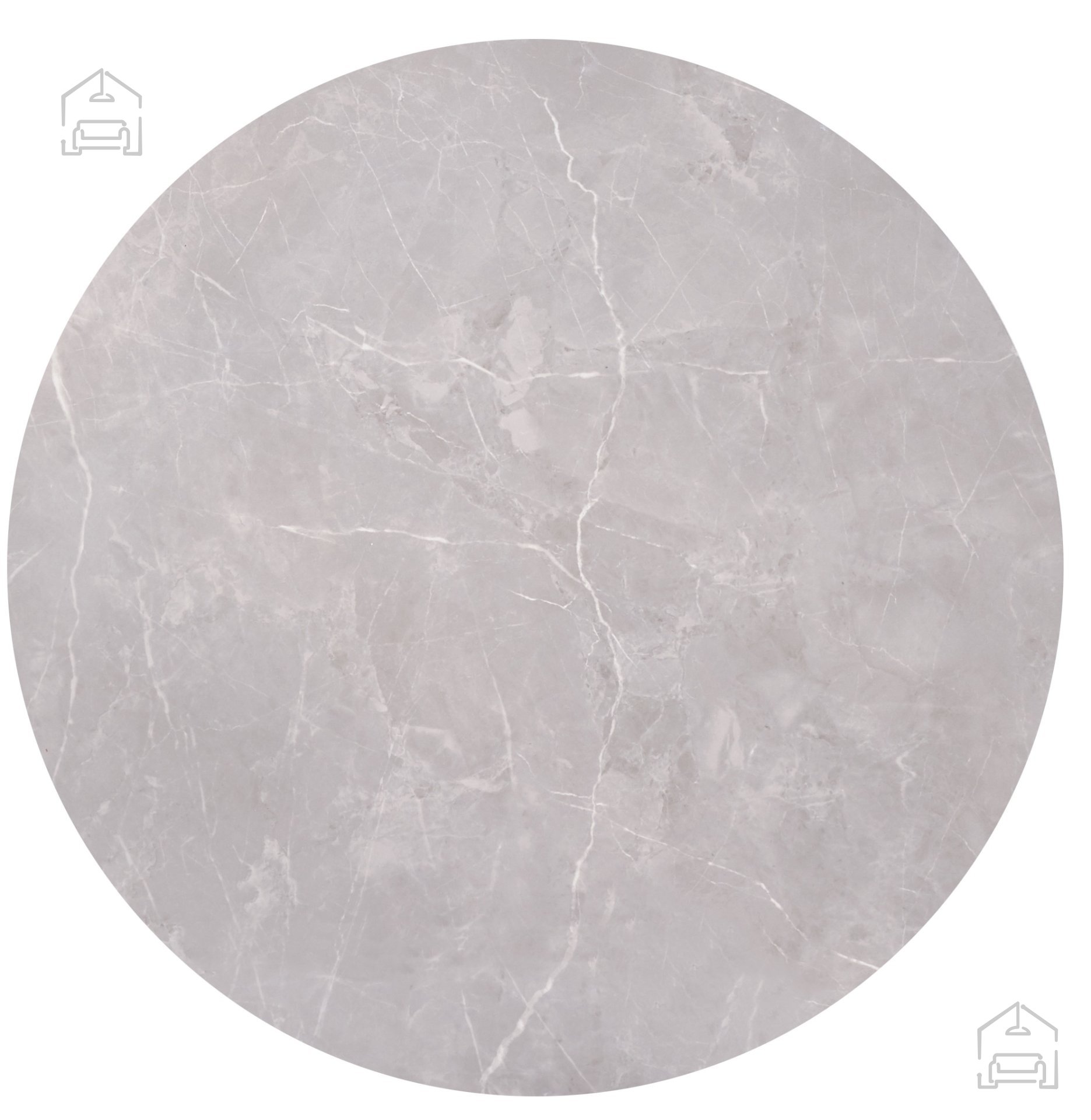 Glavna značilnost seta je uporaba sintrane keramike, ki s svojo trdnostjo in odpornostjo prekaša številne klasične materiale. Površina mize je odporna na praske, vročino in vlago, kar pomeni, da bo ohranila svoj videz tudi po letih uporabe. Podnožje iz prašno barvanega jekla zagotavlja trdnost in dolgo življenjsko dobo. Črna barva kovine dopolnjuje sivi marmor in ustvarja harmoničen kontrast, primeren za sodobne dnevne sobe, salone ali hotelske avle.