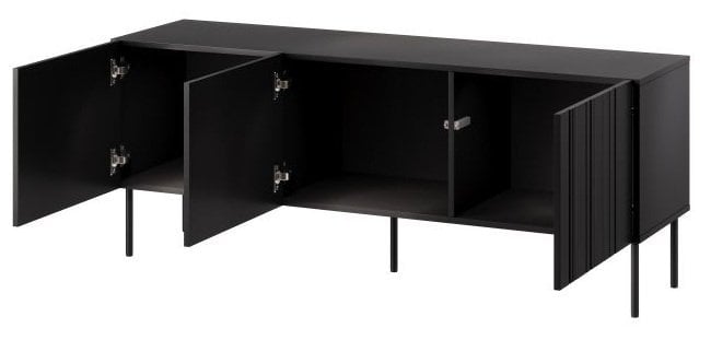 Črna barva poudari eleganco in omogoča enostavno ujemanje z drugimi kosi pohištva. Kovinske noge v črni izvedbi prispevajo k stabilnosti in vizualni lahkotnosti, hkrati pa omogočajo enostavno čiščenje tal pod komodo. Sistem odpiranja PUSH TO OPEN dodatno nadgradi uporabniško izkušnjo – brez ročajev, z gladkimi linijami in tiho mehaniko. Dovolj je rahel pritisk na fronto, da se vrata ali predali odprejo, kar daje pohištvu minimalističen in sodoben značaj.